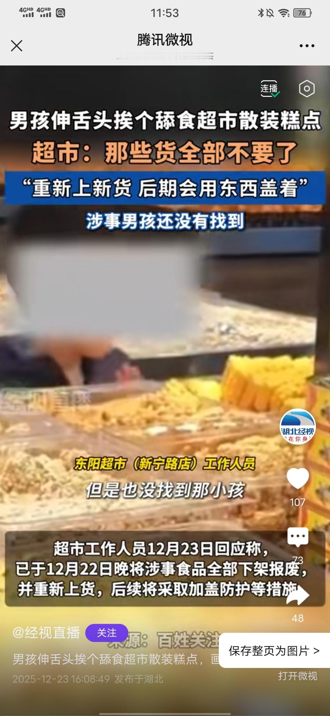男孩伸舌头挨个舔食超市散装糕点,画面全程曝光,超市只能表示,全部不要了,重新上新! 这是经视直播看到的消息,事情发生在江西九江武宁县一个超市内,视频显示,一名男孩,挨个用舌头舔食超市散装糕点,这全过程应该是被超市的顾客看到了,就拍下来了。视频曝光后,超市工作人员表示,被舔过的全部不要了,重新上架,但是具体看时间呢?22号视频才被平台推荐曝出来,大众才看到,而这个事件发生据目击者说是12月17日,而且当时就跟超市工作人员反应了这个事情。而超市23日回应,糕点在22号全部下架了,中间相差了这么多天,那么,那些被舔过的,是不是早被买走了? 如果目击者的视频没有被曝光出来,是不是超市根本也觉得无关紧要?也不会重视食品安全问题,只要能卖出去赚钱,其他都不在他们考虑范围内? 还有,谁家熊孩子这么皮?家长当时干嘛去了?自己的娃是个什么样自己心里没点数?还是说就是带他去舔的,让他去解馋的,根本也是没有想过买的,他都想尝尝,那得买多少?这样多划算?话糙理不糙,各人的娃各人看顾好,不要给别人带去麻烦和困扰,这些是基本道德和素质。 社会百态