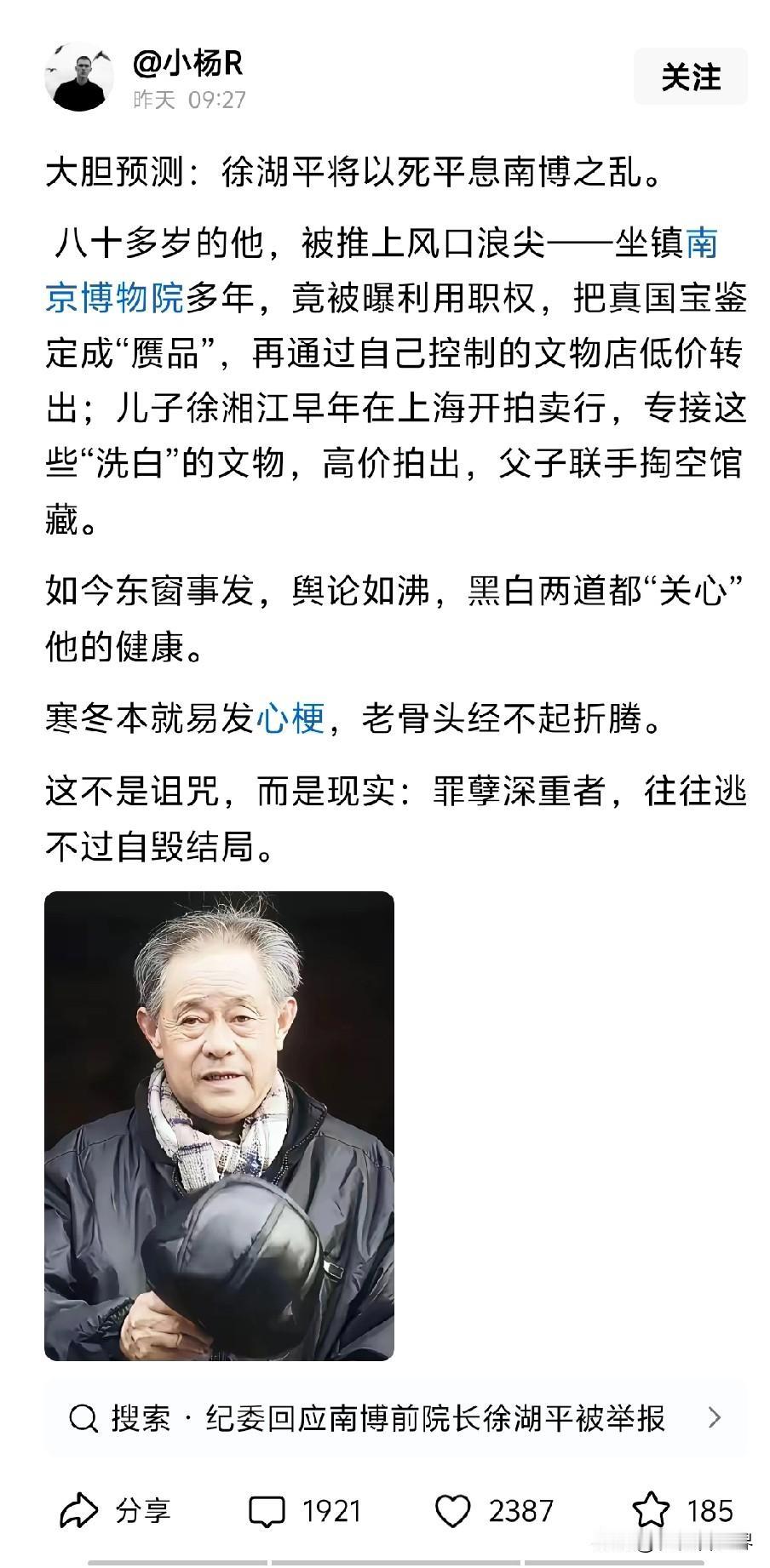 看到一个博主关于南京博物院文物事件走向的预测,感觉还真是有一定道理。有些事,真得叫“死无对证”,这个在电影、电视剧里太多了,关键人物总是会,或者说不得不通过各种方式“消失”。 但我相信真相很快就会到来。南京博物院