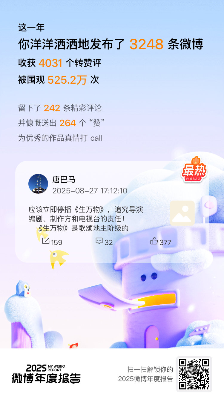 微博年度报告不是话多,是在做互联网E人这一年我一共发了3248条微博。快来看看这一年用微博记录那些小确幸吧!微博之夜 2025微博年度报告