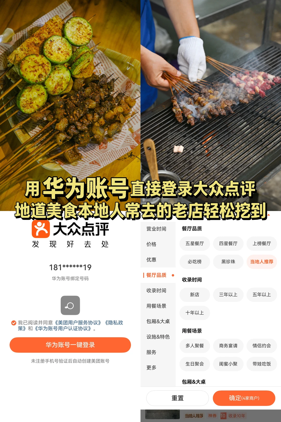 3) 找吃的就用华为账号直接一键登录大众点评、地道美食一搜就有,本地人常去的老店轻松挖到。