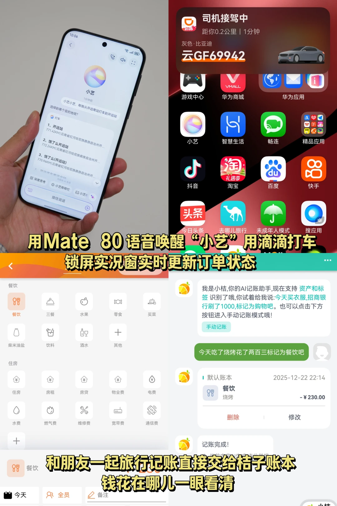 2) 从火车站出来直接用Mate 80语音唤醒 “小艺” 用滴滴打车,一句话搞定行程。锁屏实况窗实时更新订单状态,车到哪儿、牌号多少一目了然。