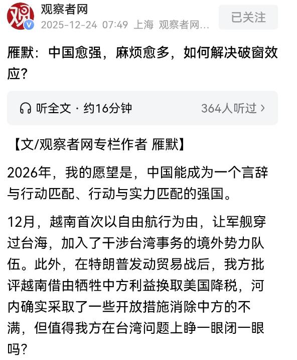 台湾评论员雁默说:2026年,我的愿望是,祖国能成为一个言辞与行动匹配、行动与实