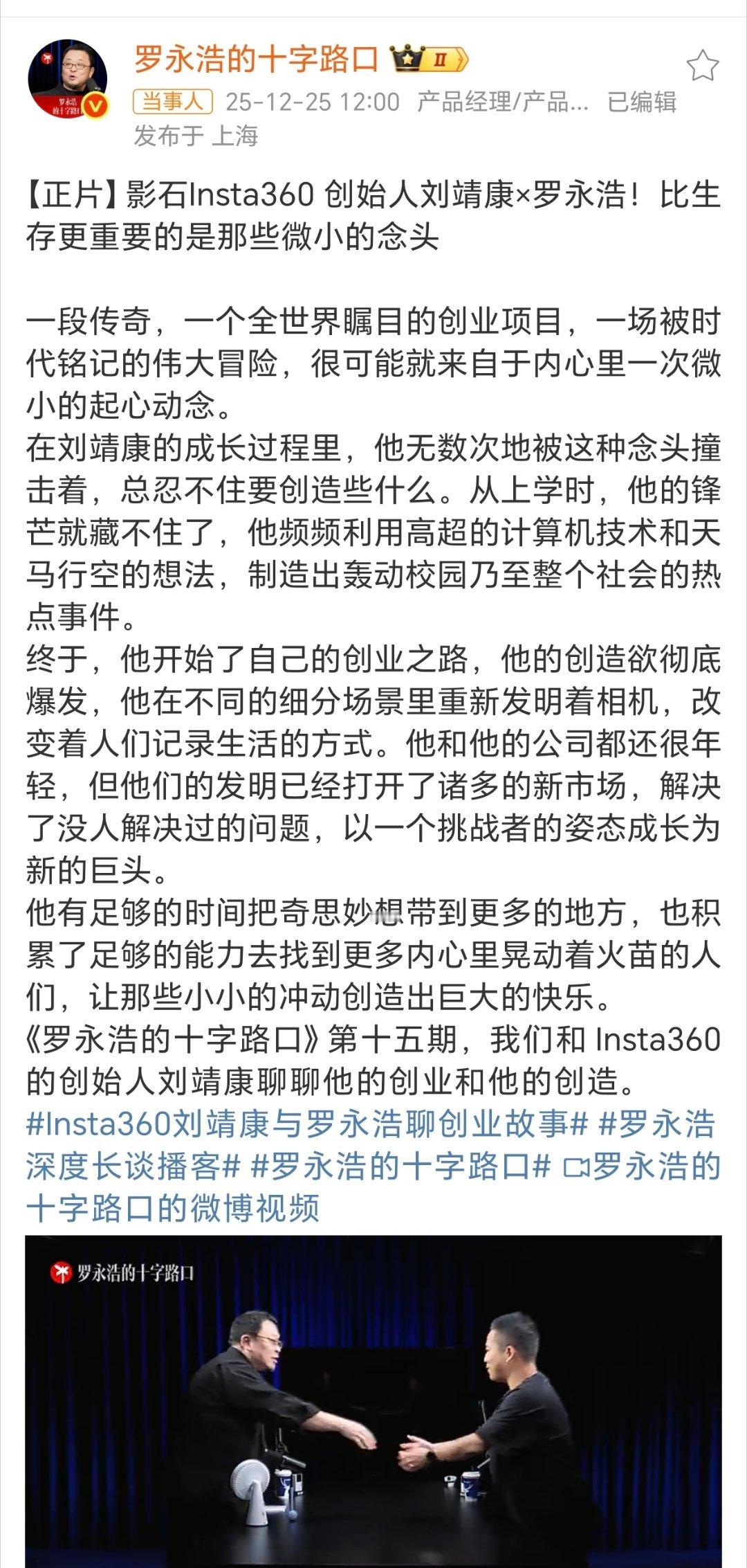 罗永浩对话影石CEO这是一场精彩的对话!坚持创业创新,影石确实做的很成功