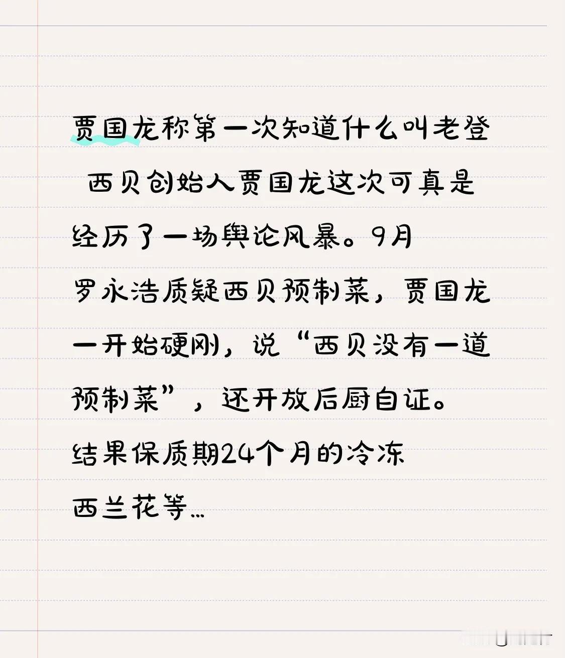 贾国龙称第一次知道什么叫老登 西贝创始人贾国龙此番深陷舆论风暴。9月,罗永浩质疑西贝预制菜,贾国龙起初强硬回应,坚称“西贝没有一道预制菜”,还开放后厨自证。然而,保质期24个月的冷冻西兰花等问题浮出水面,争议愈演愈烈,西贝日营业额损失超百万。 此后,贾国龙沉默100天。再度发声时,他坦言连续40天靠安眠药入睡,还称自己第一次知道“老登”为何意。他反思自己错在骄傲冲动。如今,西贝菜品降价,将中央厨房工艺移至门店。这也给餐饮行业提了个醒,再大的品牌也需顺应消费者期待。 西贝现状 西贝翻车 西贝降热搜账单