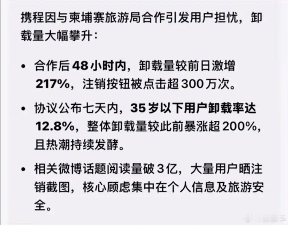2025年,如果有人邀请你去柬埔寨“共赴星辰大海”,你大概率会反手一个举报。但如果邀请你的是中国最大的在线旅游服务商携程,你可能会陷入沉思,是这家公司疯了,还是这个世界终于进化到了你看不懂的样子?携程与柬埔寨旅游局的营销合作引发了史诗级的公关灾难。48小时内,APP卸载量暴涨217%,300万次注销点击,这哪里是用户在点按钮,这分明是用户在给这出降智大戏点丧钟。坐在上海凌空SOHO那充满未来感的办公室里,吹着恒温24度的中央空调,携程的精英们大概正盯着精美的PPT。在他们的Excel里,柬埔寨是“东南亚旅游增长极”,是“战略要地”,是待开发的“蓝海市场”。然而,只要他们哪怕有一个人,肯关掉那些镀金的行业研报,打开手机搜索一下“西港”或“金边”,跳出来的关键词足以让任何一个正常人脊背发凉,电诈、绑架、美金墙、腰子、谨慎前往。一边是不断更新的安全提醒,一边是携程雄心勃勃的营销蓝图。这种认知的割裂,让人不禁怀疑,大厂的层层审批流程,是不是自动过滤了“人命”这个变量?人们总以为大厂有顶级的风控、严密的逻辑和最强大脑。但这次事件再次证明了那个真理,世界就是一个巨大的草台班子。这波操作完美诠释了什么是决策层认知的崩塌。当普通网友都在讨论如何避开东南亚杀猪盘时,这群年薪百万的职业经理人,却试图把中国游客往那个舆论漩涡里推。这种决策逻辑的本质是,他们不再看现实世界发生了什么,他们只看KPI需要什么。 只要协议签了,数据好看了,至于那个地方是不是“法外之地”,似乎并不在他们的算法模型里。这种傲慢,是典型的精英式盲目——他们以为掌握了大数据,却丢掉了最基本的社会痛感。携程在声明中急忙撇清:合作未启动,不涉及数据。但这已经不重要了。用户愤怒的不仅仅是那几行代码或几条广告,而是一种被背叛的幻灭感。作为一个深耕旅游行业多年的领头羊,携程本应是用户的“安全盾牌”,结果它却差点成了“引路猎人”。当超过300万人点击注销按钮时,他们注销的不是一个账号,而是对“大牌信誉”的最后一点幻想。携程回应柬埔寨合作争议
