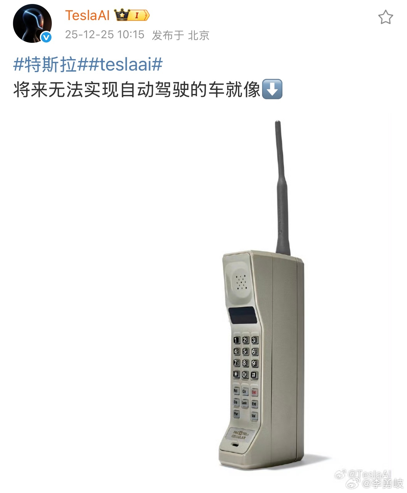 TeslaAI:将来无法实现自动驾驶的车就像大哥大!12月17日,特斯拉首席执行官埃隆・马斯克在社交网络上评价称,没有自动驾驶能力的燃油车,就像“骑着马用着翻盖手机”特斯拉你变了,营销开始加码了!大家怎么看?特斯拉称没有自动驾驶的车像大哥大