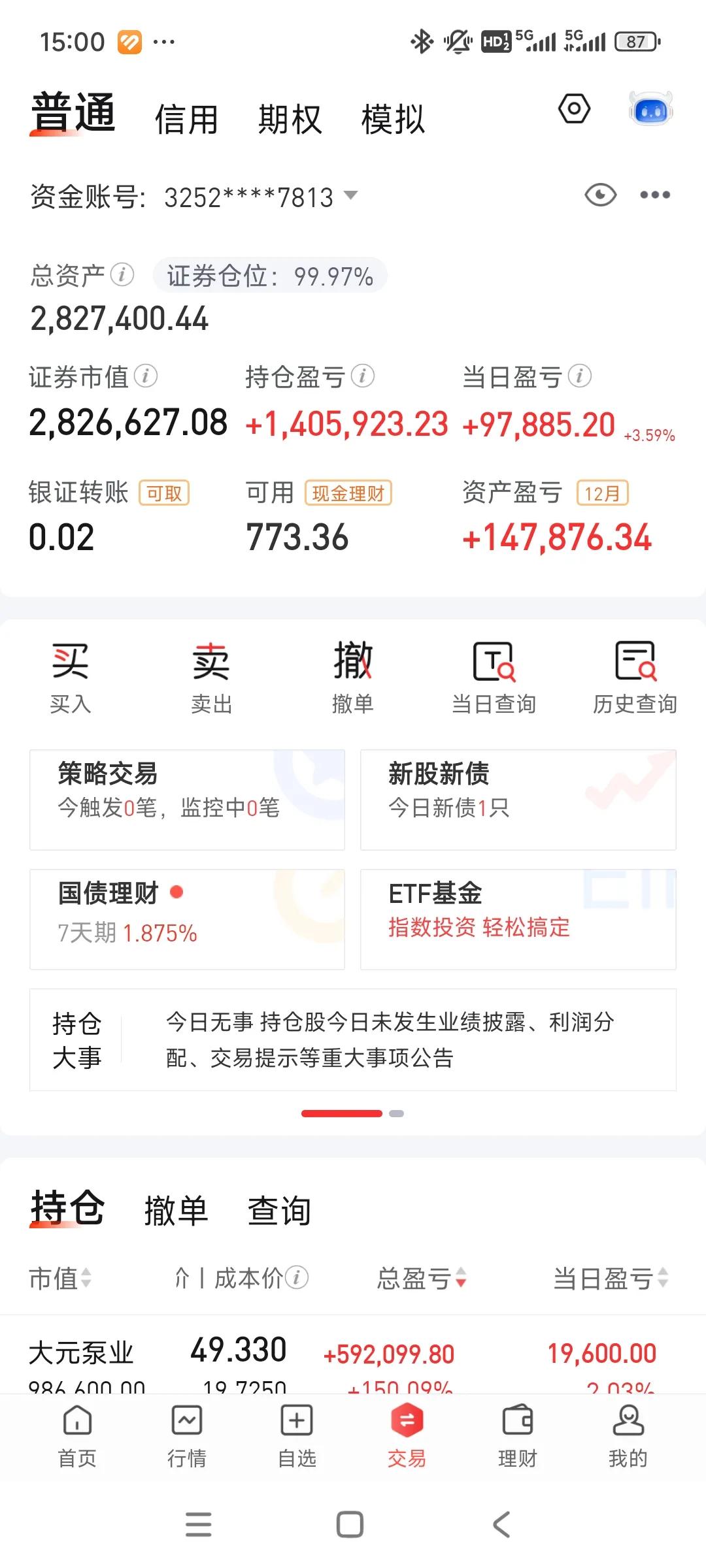 今天大肉,账户回到270,大元涨停但是没有带动板块。
