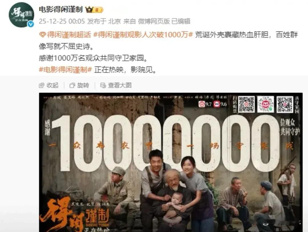 1000万人抢着看的“神片”!《得闲谨制》这部荒诞土味剧凭啥火出圈? 20天破千万观影人次,这数字够吓人吧?《得闲谨制》这匹“黑马”可真会整活儿!没有流量明星堆砌,没有炫酷特效轰炸,偏凭一群“泥腿子”愣是把电影院炸出了花! 咱老百姓为啥爱看这戏?说白了就是——真香! 你看那些手艺人抡起铁锤跟鬼子干架,菜市场大妈抄起擀面杖当武器,哪像电影啊?活脱脱咱街坊四邻的日常!肖战演的莫得闲,从“佛系打铁匠”变身“暴躁抗日兵”,那股子憨劲儿让人直想给他递烟点火。彭昱畅演的怂包兵更是绝了,裤裆尿颤着还能掏出辣椒面糊鬼子眼,笑完立马鼻酸——原来英雄就是咱身边这些“怂包”啊! “自来水狂魔”才是真主角! 朋友圈里刷屏的“笑出眼泪”“哭湿纸巾”,微博上满屏的“已二刷准备三刷”,抖音里剪辑的“土味抗战名场面”……这哪是宣发?分明是全国网友组团给电影打call!听说有大爷看完攥着瓜子说:“这才是俺们中国人的硬骨头!”这波情怀牌打得,导演都得给观众鞠躬! 行业大佬都看傻眼了! 原本以为大场面+大明星才是王道,结果《得闲谨制》用“土味美学”直接破防。豆瓣8.5、猫眼9.2的高分,五万观众集体盖章认证——原来观众不是看脸,是看心!当电影院里响起“苟利国家生死以”的土味呐喊,后排大爷大妈跟着鼓掌,前排小年轻红了眼眶,这不就是最好的票房密码? 要说这电影最妙的,还得是“笑中带泪”的神操作。一边是大爷大妈抡着擀面杖笑出声,一边是手艺人用祖传手艺炸鬼子炮楼飙泪,这反差萌谁顶得住啊?难怪官微发完“感谢1000万战友守家卫国”后,评论区秒变大型“爷青回”现场。 所以啊,与其说《得闲谨制》是黑马,不如说它是一面镜子——照出了平凡人的不平凡,也照出了观众对“真故事”的渴求。现在排片量还在涨,各位老铁,还没看的赶紧冲,毕竟这年头能让人笑着流泪的国产片,可不多了! 电影《得闲谨制》观影人次破1000万 电影得闲谨制 肖战 彭昱畅 抗日