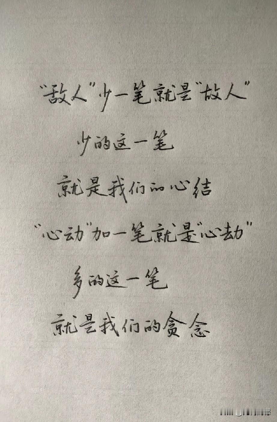 这段话不知道是哪一位高人写的,看似是比较浅显的拆字法,但却蕴含着深刻的哲理,越品越有意思,越品越有味道,给人带来了很大的启发。“敌人”少一笔就是“故人”,少的这一笔,就是我们的心结。“心动”加一笔就是“心劫”,多的这一笔,就是我们的贪念!