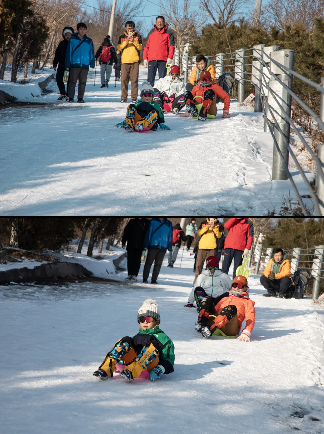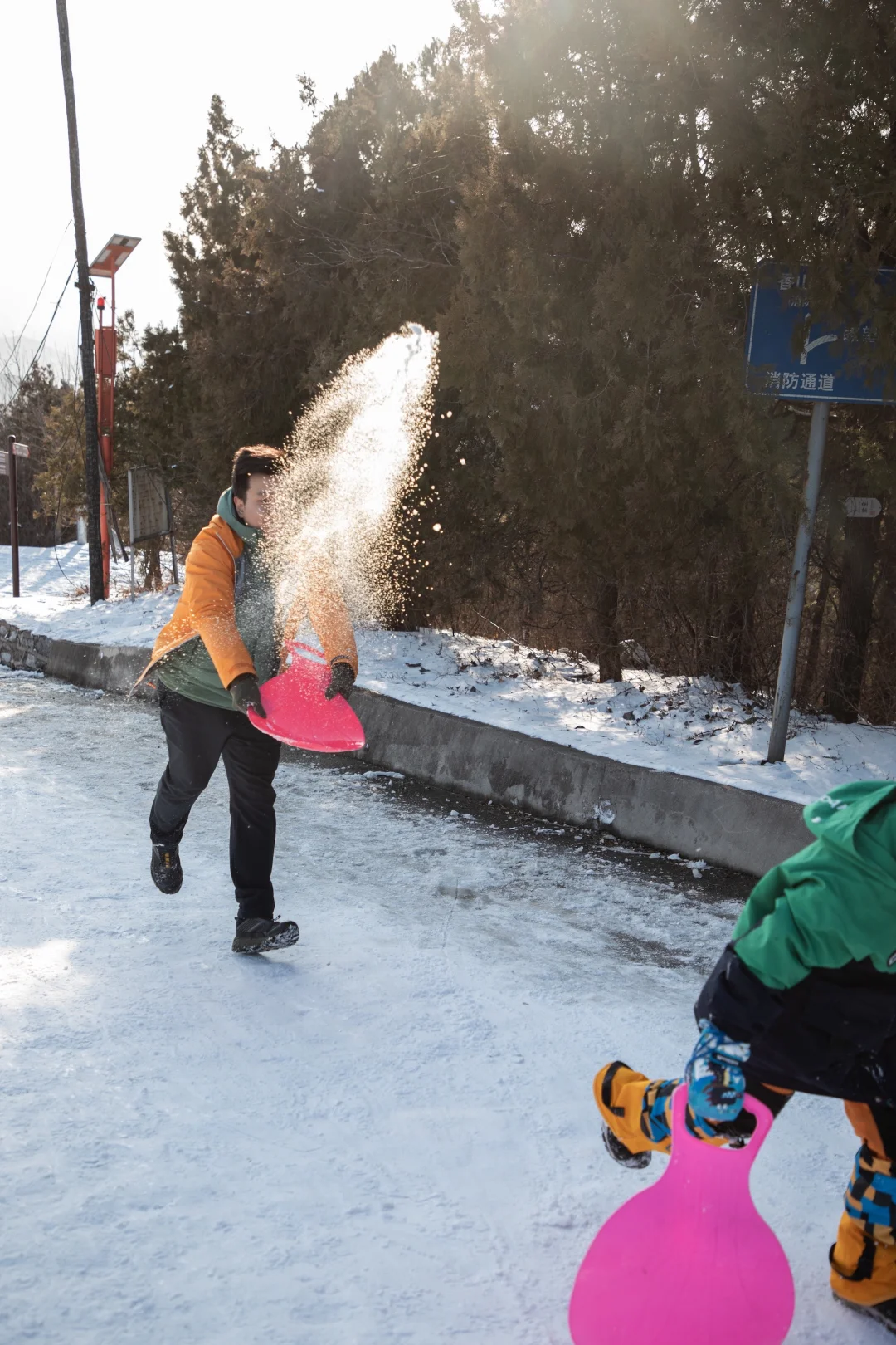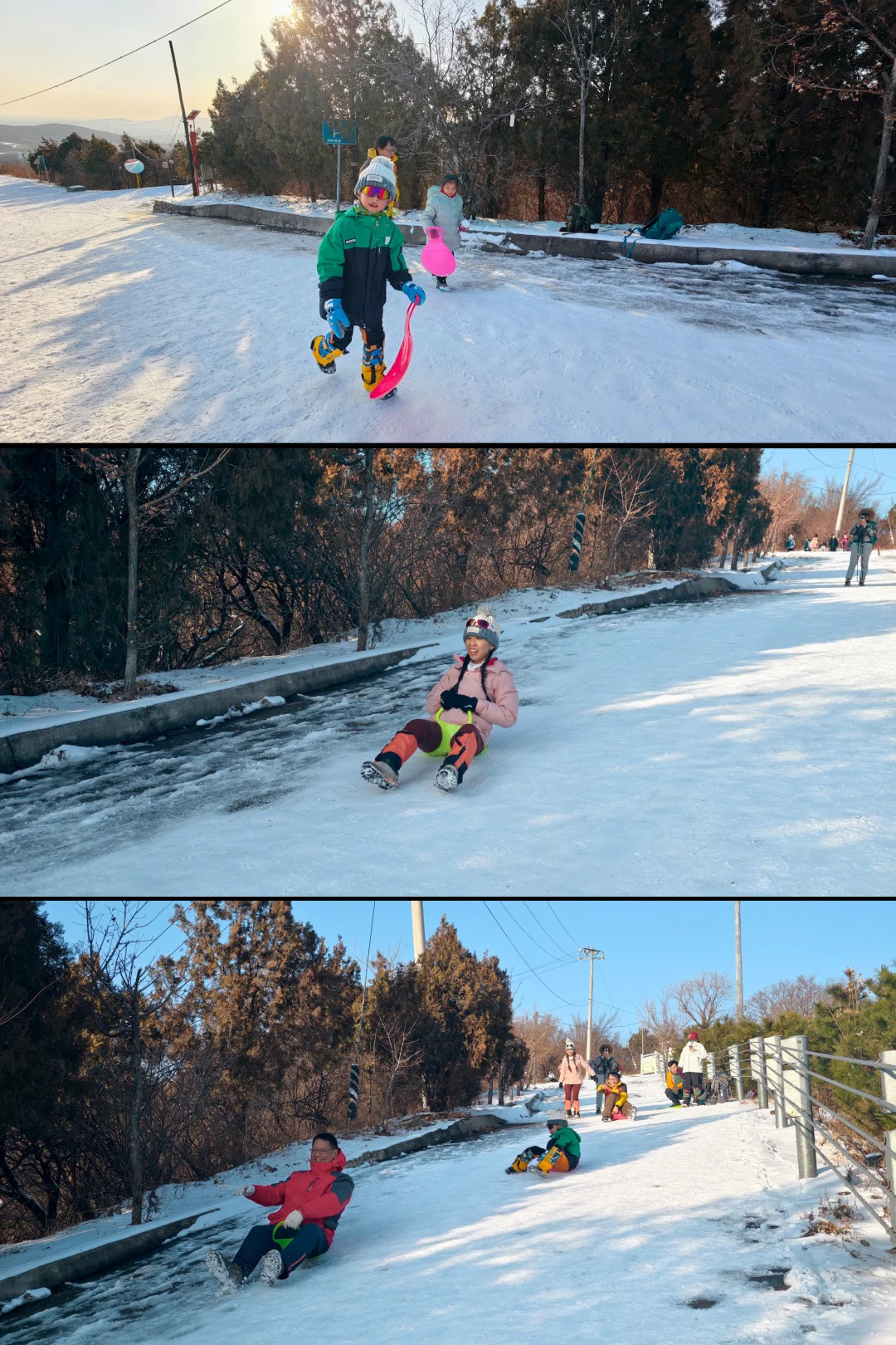 ❹上到防火道后,就开始玩小滑板了,天然免费的滑场,平时普通甚至我们会选择避开的防火道在雪的加持下,变得如此好玩。一定记得要带小滑板,路上遇到没带感到遗憾的朋友,还有跟我们借板玩的小朋友