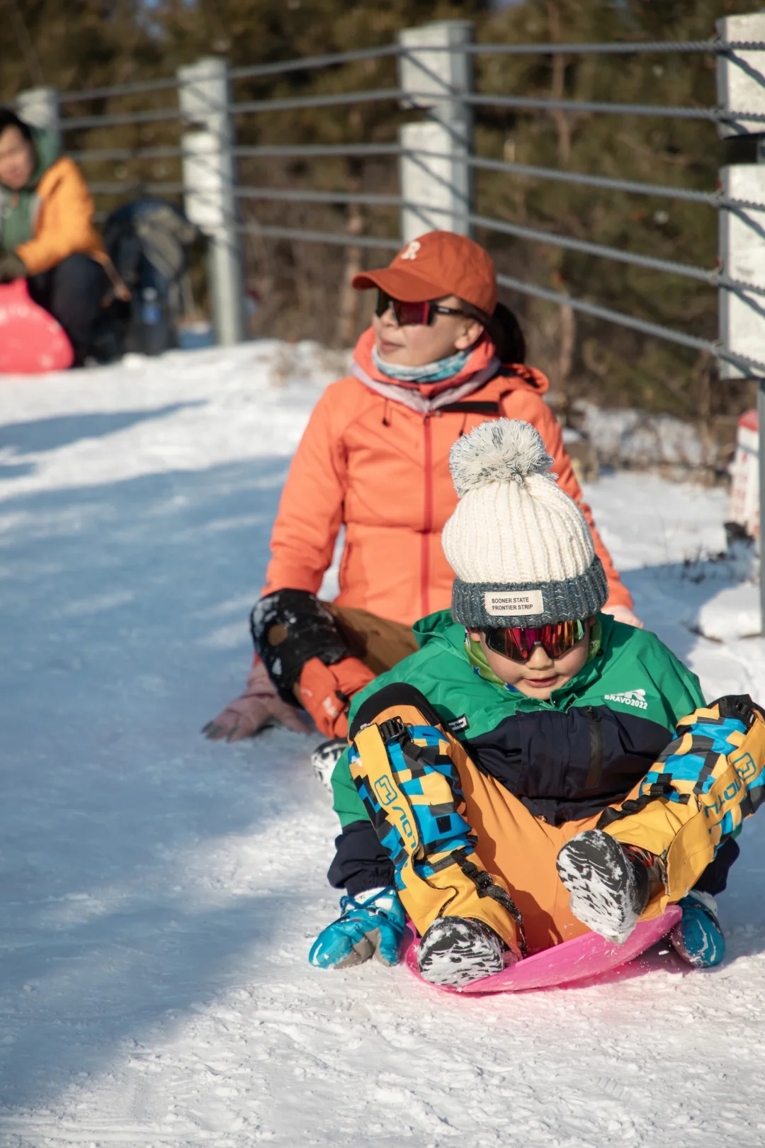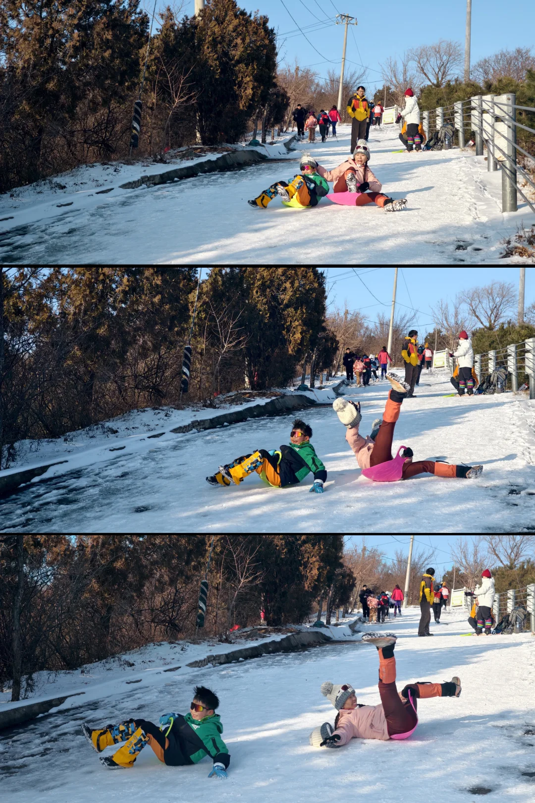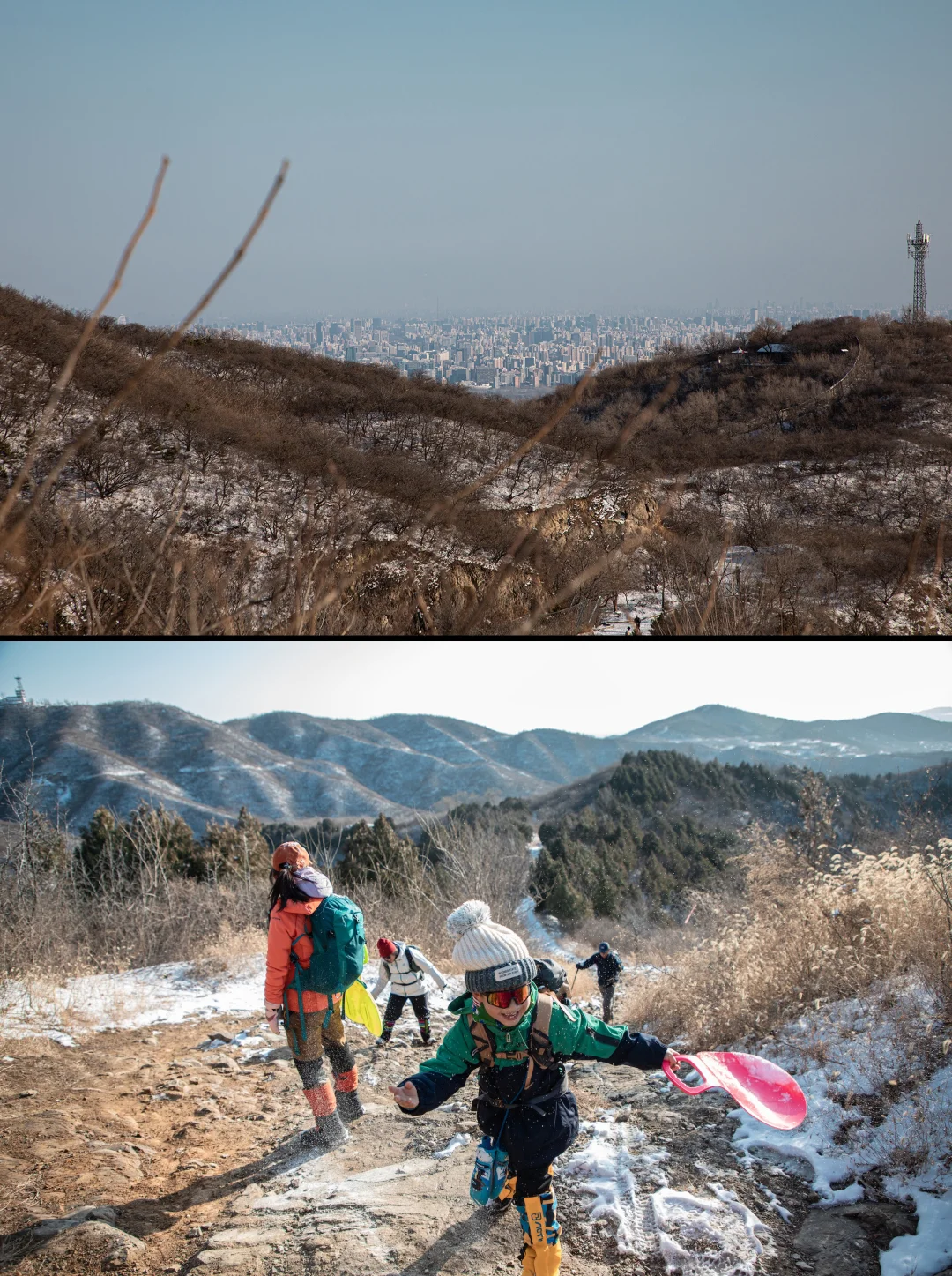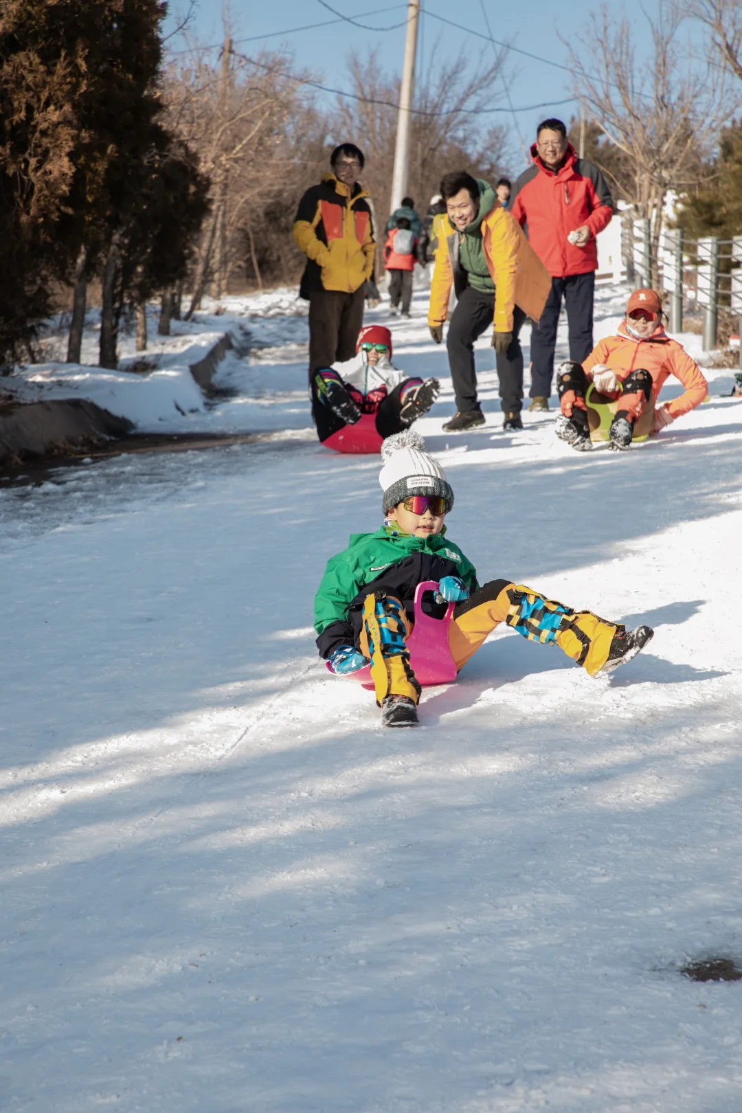 ❹上到防火道后,就开始玩小滑板了,天然免费的滑场,平时普通甚至我们会选择避开的防火道在雪的加持下,变得如此好玩。一定记得要带小滑板,路上遇到没带感到遗憾的朋友,还有跟我们借板玩的小朋友