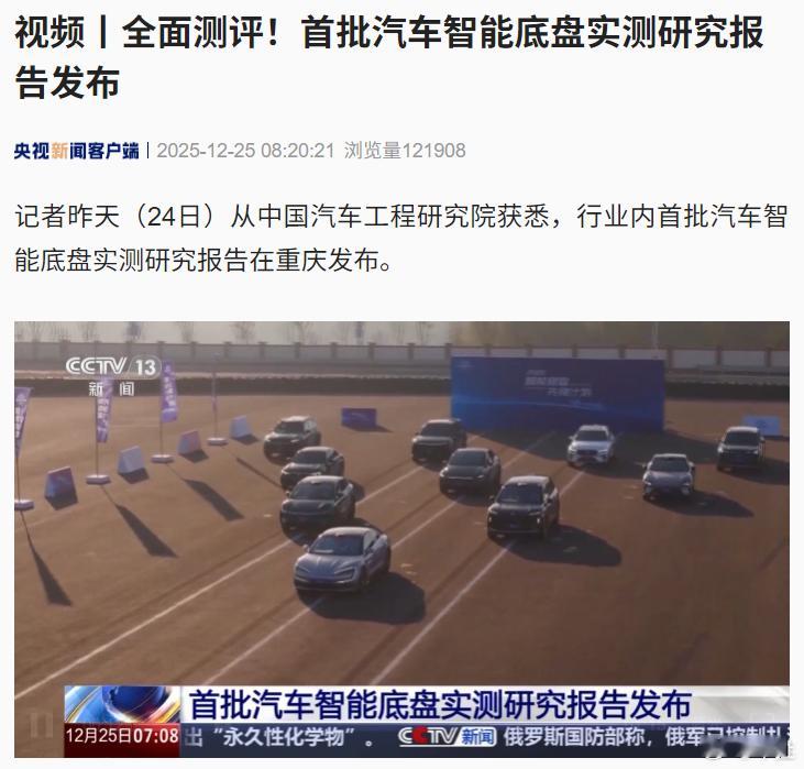 12月25日,央视新闻发布消息称,国内汽车行业首批智能底盘实测研究报告已于重庆正式发布。本次测评由中国汽车工程研究院牵头开展,研究团队筛选出十余款市场主流车型,针对性设计了13类典型测试工况,涵盖弯道爆胎、十字路口过弯抗滑干扰、对开坡道起步等极具挑战性的用车场景,同时围绕20余项核心指标完成全方位性能验证。