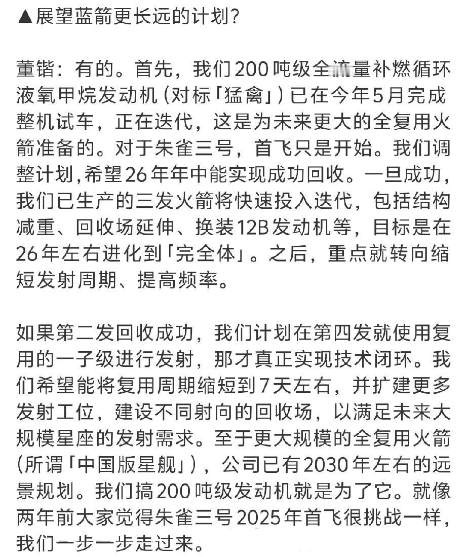 这真是科普好文,蓝箭航天朱雀三号副总设计师董锴接受媒体采访,就朱雀三号的发射、回收及2026年蓝箭计划做了详细解读,对我们了解朱雀三号首飞幕后情况有很好的帮助,科普性很强,不妨一读。 要点信息摘录: 1,朱雀三号首飞情况定调为“发射取得圆满成功”,二级入轨完全达到标准,整体任务是“基本成功”,因为回收没有成功。 2,首飞没有采取最大射程,是为了安全起见,回收射程定在 390 公里,要发挥最大运力,射程可达550-600公里。 3,2026年年中,朱雀三号换装天鹊-12B发动机,进化到完全体。 4,明年朱雀三号第四次发射将复用回收的一级。 5,蓝箭已指定2030年远景计划,对标SpaceX星舰的全复用中国版星舰正在开发中,200吨级全流量补燃循环液氧甲烷发动机已完成整机试车,正在迭代中。