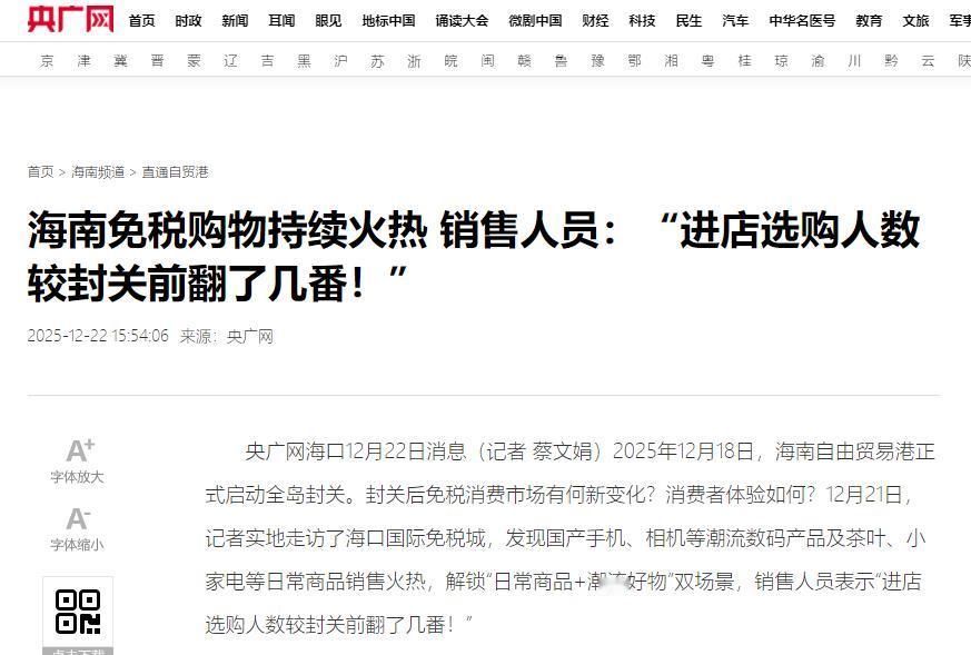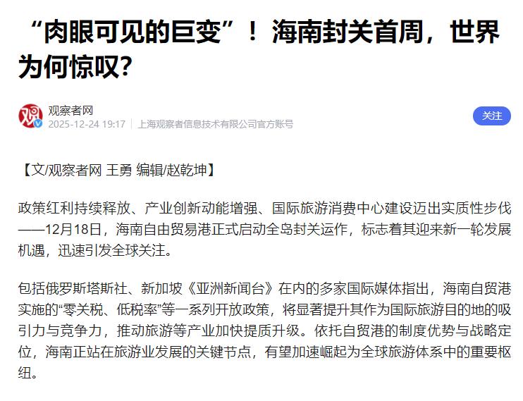 “肉眼可见的巨变”!海南封关首周,世界为何惊叹? 最近最让人提气的,就是海南全岛封关开始运作了!12月18日启动到现在才一周,变化大得肉眼都能看清。 不管是去旅游购物的人,还是在那儿做生意的企业,都真真切切尝到了政策的甜头。 这可不是虚头巴脑的政策概念,全是实打实的改变,难怪俄罗斯、新加坡这些外国媒体都盯着看,一个劲儿夸中国这个开放窗口有活力。 其实世界惊叹一点都不奇怪,这一周海南拿出的成绩,全是“巨变”的硬底气。 最明显的变化就在老百姓的购物车里、饭桌上。以前说去海南买免税品划算,现在封关后更划算,能买的东西也多了。 就说大家爱吃的猫山王榴莲,封关第一天海口超市里才卖88块一斤,比之前便宜一半还多,1.5吨榴莲1小时就被抢光,跟赶大集似的热闹。 澳洲进口牛肉每斤也比内地便宜20多块,普通人家也能常吃上进口生鲜了。 除了吃的,买数码、黄金这些大件也省钱。三亚免税城里,苹果手机门店排满了人,最新款的比官网便宜两千多,够买张往返海南的机票了。 黄金每克比内地便宜160多块,有对成都小夫妻专门打飞的来买婚礼首饰,一下子省了近5000块。 现在免税品还加了宠物用品、扫地机器人这些以前没有的,游客和本地人都能享好处。 海口海关数据显示,封关首周免税购物花了11亿,16.5万人来买,比去年同期多了一半多。 其实购物便宜只是表面,真正让全世界惊叹的,是海南办事效率和吸引企业的本事。 以前企业进口设备,申报、核验要等好几天,填上百项信息,现在就填33项,效率翻了倍。 北大口腔三亚医院进口的高端医疗设备,3分钟就通关,还免了12%的税;国药器械进口科研设备,不光通关快,还省了近20万税款,企业直接拿到了实惠。 而且这一周里,好多优质项目都扎堆往海南跑,全球企业都在抢这个机会。更关键的是,海南封关不是关起门自己玩,而是敞开大门欢迎全世界。 这次“零关税”商品从1900多种扩到6600多种,绝大多数进口商品都能免税,三亚港一批300万的货物15分钟就通关,还免了40万关税。 这一周的变化,不管是老百姓感受到的购物方便,还是企业拿到的政策红利,都在说“巨变”不是空话。 以前去海南就想着看海度假,现在能购物、康养,玩法多了;以前企业去海南顾虑多,现在通关快、成本低,都愿意扎根。 海南早就不只是“旅游岛”了,成了充满活力的开放高地。世界的惊叹,既是认可海南的发展速度,更是看好中国持续开放的魄力。相信后续政策落地,海南还会带来更多惊喜。