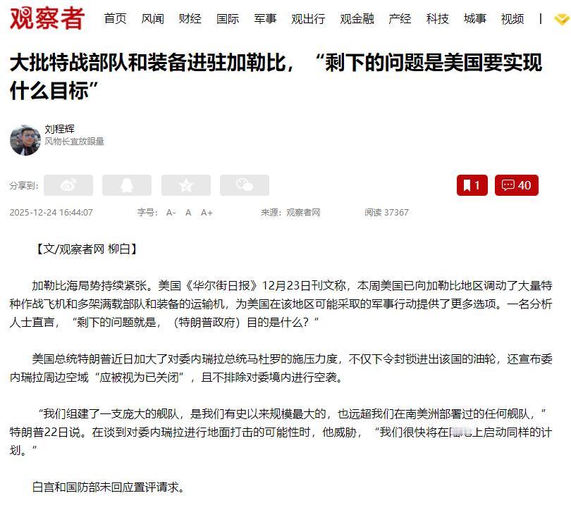 大批特战部队进驻加勒比:美国的真实目标绝不简单 据美媒12月23日报道:现在加勒比海可不太平,美军带着大批特种兵和重型装备往那凑,战机在空中转,战舰在海上漂,这阵仗看着就吓人。 美国自己的报纸都报道了,说美军已经调了不少特种作战飞机和装满兵、装备的运输机过去,就等下一步行动了。 明眼人一看就知道,现在关键不是美军敢不敢动手,而是特朗普政府费这么大劲增兵,到底想干啥? 想搞明白这事,先看看眼下的紧张劲儿。特朗普政府最近盯着委内瑞拉总统马杜罗不放,又是封人家的油轮断经济来源,又是霸道说委内瑞拉周边空域“算关了”,甚至放话可能空袭。 再加上这次大规模调兵,简直是把刀架到马杜罗脖子上了。大家可能会信美国说的要打击贩毒,可实际上这就是个幌子。 看看美军这次的投入就知道,根本不是为了缉毒。据可靠消息,美军在加勒比海凑了1.5万名士兵,还派了“福特”号航母带头,几十架战机、十几艘战舰跟着,这规模几十年都少见,上一次这么大阵仗还是1962年古巴导弹危机的时候。 美国还把废弃21年的军事基地重新启用,部署先进战机,又在巴拿马搞丛林作战训练,这哪是缉毒需要的阵仗?再说了,美国自己境内制毒的地方多的是,真要禁毒,咋不先清自己家门口的? 美国嘴上喊缉毒,实际净干滥杀无辜的事。有统计说,到10月底,美军以缉毒为名在这一带炸了14艘船,死了57人,到12月就超80人了。 最过分的是,美国压根拿不出证据证明这些船运毒。连美国自己的军官都看不下去辞职了,其他国家的学者也说这是违法的。很明显,缉毒就是借口,美国真实想法是推翻不听它话的马杜罗政府。 这也不是美国第一次干这种事了,以前在拉美就常干涉别国内政。比如1994年插手海地,把自己支持的人推上台。 上世纪80年代借反恐名义搅和中美洲内战,让当地老百姓遭了大罪。这次对委内瑞拉,不过是换个借口重复老套路。 说到底,美国这么上心,核心还是为了委内瑞拉的石油。委内瑞拉石油储量世界第一,而且这种石油刚好适合美国炼油厂用,成本低、效率高。 就算美国自己也产石油,每天还得从委内瑞拉进口十几万桶,控制了这里的石油,美国就能保住实实在在的利益。 更深一层,美国是想把拉美重新变成自己的“后院”,巩固霸权。委内瑞拉不听美国的,还跟其他国家合作,在美国眼里就是眼中钉。 这次增兵就是想吓唬马杜罗妥协甚至下台,也给其他拉美国家提个醒,让它们不敢不听话。 但美国这算盘未必能成。不少拉美国家都谴责它破坏稳定,委内瑞拉自己也不怕,搞军演、布导弹,还在国际上揭露美国的野心。美国国内老百姓也不支持打仗,真打起来美国自己也得吃亏。 说白了,美国增兵根本不是为了缉毒和稳定,就是为了抢石油、推翻人家政府、巩固霸权。 这种霸道行径没人支持,再强的军事部署,也挡不住各国想自己做主的决心,最后只会证明美国的霸权在走下坡路。