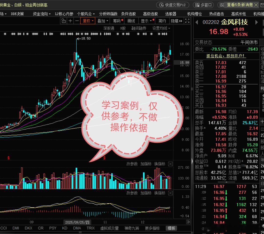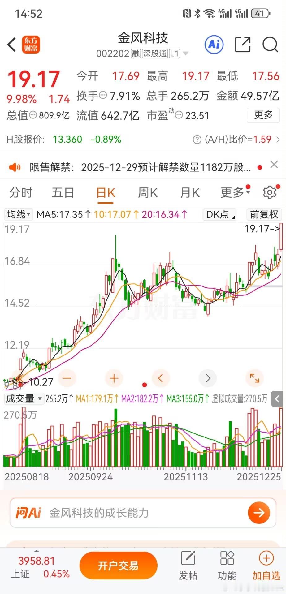 金风科技,终于迎来了突破股票没有三重顶,金风科技今天终于迎来了放量涨停的突破。金风科技,是我前两面建议群友上车的,今天不负众望,也算是一个短平快的。我喜欢高位大成交量的股票,这个和很多人的习惯是不同的,因为我个人高位大成交量是大资金抱团的一种特征。12月23日,金风科技虽然是高开低走,但是我认为启动前的一次主动回撤,原因很简单,高位震荡的箱体顶部这是第四次被攻击,攻击的次数代表着主力的诚意,次数越多代表着突破的成功率就越高。不过很有意思的是,金风科技A股今天放量涨停,但是港股却丝毫不动,为什么金风科技的A股比港股强这么多,这个是耐人寻味的。接下来就是随时跑路,希望明天还有3-5个点的溢价。欢迎加入我们的免费交流群财经股票