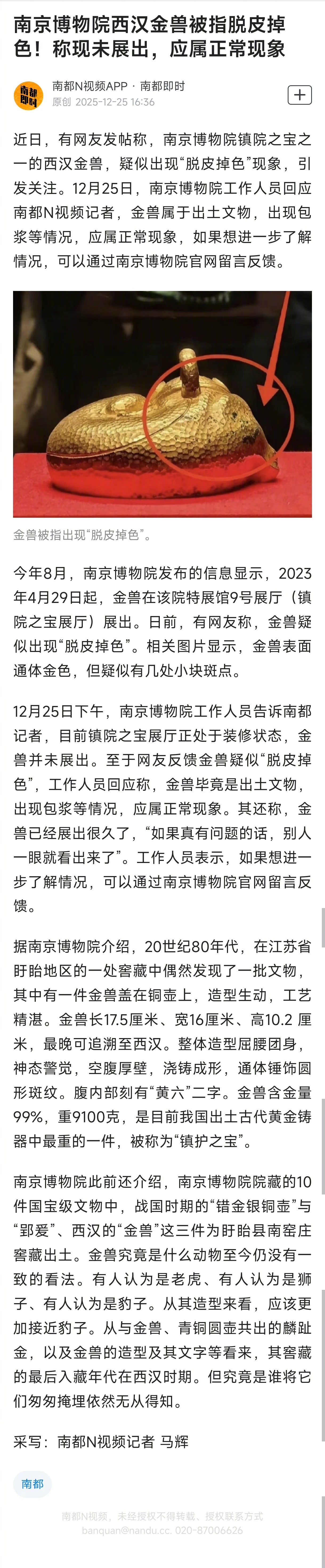 #南博回应金兽脱皮称系正常现象#【#南京博物院西汉金兽被指脱皮掉色#!称现未展出,应属正常现象】近日,有网友发帖称,南京博物院镇院之宝之一的西汉金兽,疑似出现“脱皮掉色”现象,引发关注。12月25日,南京博物院工作人员回应南都N视频记者,金兽属于出土文物,出现包浆等情况,应属正常现象,如果想进一步了解情况,可以通过南京博物院官网留言反馈。今年8月,南京博物院发布的信息显示,2023年4月29日起,金兽在该院特展馆9号展厅(镇院之宝展厅)展出。日前,有网友称,金兽疑似出现“脱皮掉色”。相关图片显示,金兽表面通体金色,但疑似有几处小块斑点。12月25日下午,南京博物院工作人员告诉南都记者,目前镇院之宝展厅正处于装修状态,金兽并未展出。至于网友反馈金兽疑似“脱皮掉色”,工作人员回应称,金兽毕竟是出土文物,出现包浆等情况,应属正常现象。其还称,金兽已经展出很久了,“如果真有问题的话,别人一眼就看出来了”。工作人员表示,如果想进一步了解情况,可以通过南京博物院官网留言反馈。网页链接