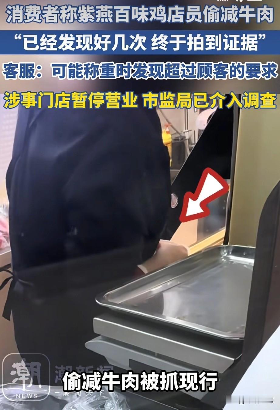 太贪心了!网曝某紫燕百味鸡店员工偷拿已经称过重的牛肉,被抓现行。客服的回复让人大跌眼镜,目前涉事门店已停业,市监局介入调查。 12月24日,南通凯旋路菜市场,一男子如往常一样去紫燕百味鸡店买牛肉。他是这家店的常客,感觉这里的牛肉非常好吃,店面卫生也比较放心,唯一的缺点是卖的比较贵。 在最近几次的消费中,男子感觉买到手的东西在同样金额的情况下,比以前少了,仔细看价格标签,并没有上涨,虽然他有点怀疑是店员做了手脚,但是并没有证据。 这次,男子想好好观察一下到底怎么回事。店员热情的帮他盛好牛肉,他拿起手机准备付款时,却惊奇的发现了一个他不可思议的一幕。店员把盛了牛肉的盒子拿起,做出准备拿袋子装的动作,她的身体前倾,和另外一个顾客说话的同时,右手拿着盒子,左手在身体的掩护下在盒子里拿牛肉。 男子的手机正好把这一幕拍了下来,虽然只排到了店员左手的指尖抓取牛肉,但毫无疑问的是,店员就是把已经称好重的牛肉拿走了一小部分。 店员的一套动作如行云流水般娴熟,可见不是第一次了。男子果断打了这个店的投诉电话。但是客服的回复这让男子感觉不可思议,客服说:可能称重时发现超过顾客的要求。 客服的意思,称重时发现超过顾客的要求,比如顾客要60块钱的,实际价值是80块钱,那就可以大大方方的拿出来一点,为什么要你身体做掩护,偷偷摸摸的拿呢。 男子把这个视频发到网上以后,无独有偶,有不少网友也遇到过同样的遭遇。 有人说:同样的分量,现在就是觉得量比之前要少,所以现在很少买紫燕,本来价紫燕价格还贵。 还有人说:破案了,终于破案了,我说上一次我买那个牛肉,我跟我老婆两个人吃,到最后才发现一个人吃都不够,但是买其他家的牛肉两个人吃就够了。 更有人说:我有次买白切鸡,鸡腿那一部分店员帮切,回家后发现下面埋着鸡头,不知道他什么时候换的。 一个顾客发现问题,可能是某一个员工临时起意,多个顾客发现同类的问题,只能说这样的店真是无良无德。发现问题后有人悄悄的走了,再也不会来消费,有的人就会硬刚到底,把问题展示出来。 现在,那家店已经暂停营业,市质量监督局已经介入调查,不知道后续会有什么结果。 做生意诚信为本,这样缺斤少两是不会长久的,回头客只会越来越少。没有回头客就赚不到米,这是自寻死路。希望有不良行为的商家自查自纠引以为戒和气生财。