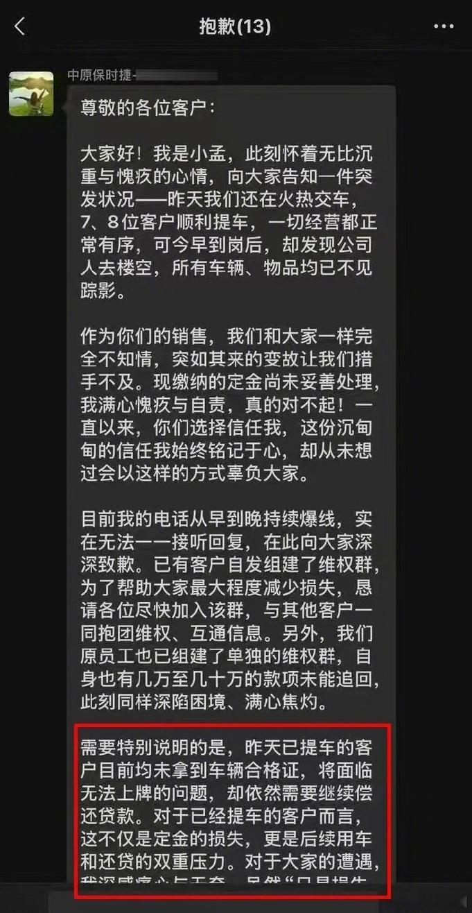 保时捷店连夜跑路我开始以为是段子,但这聊天截图看着像真的啊。门店倒了保时捷车主没法上牌仍还贷网红保时捷门店被曝欠薪数十万