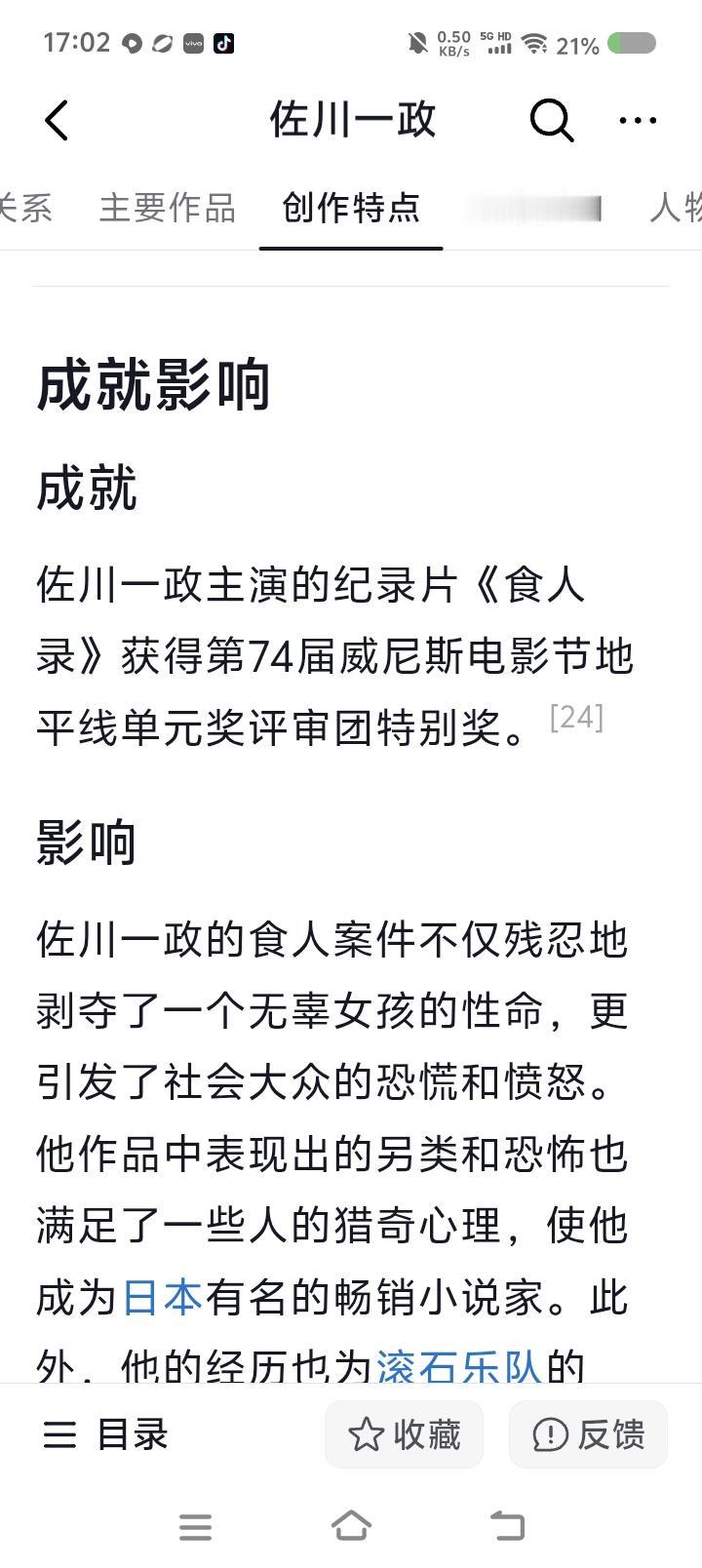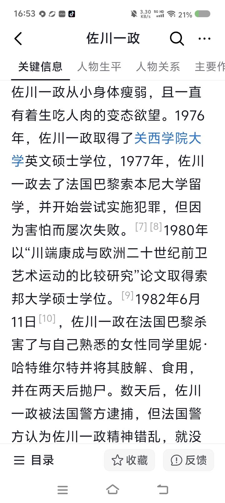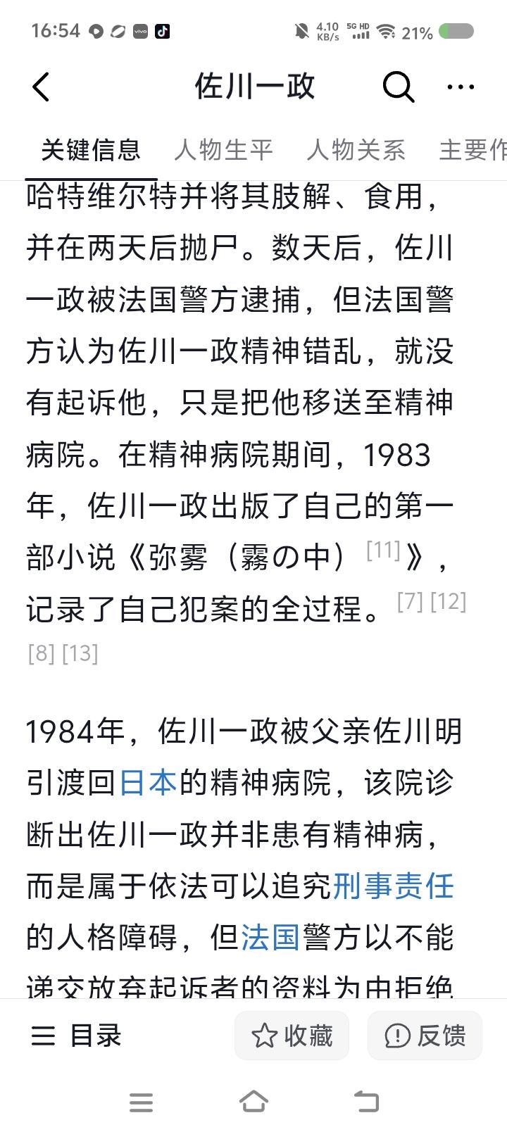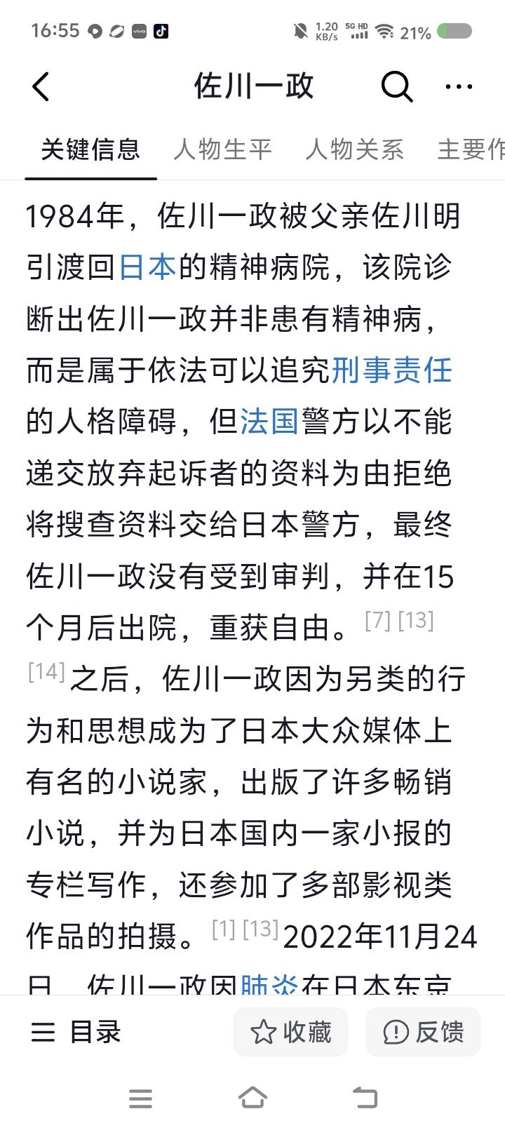 佐川一政现象的背后—— 资料显示:佐川一政,日本人,被称为“神户shi人魔”。1982年在法国杀官了一名女子,肢解、shi用、抛尸。被捕。被认为精神错乱,没被起诉,送进精神病院,期间出版了小说,回顾了行凶过程。后来,被家人引渡回国,住进精神病院。该院鉴定他没有精神病。因法国拒绝移交不起诉者的资料,日本没有起诉。一年多以后,他重获自由。之后,出书,拍影视,作品不少。2022年去世。 值得注意的是:他主演的纪录片在威尼斯电影节上获过奖;他弟弟出版了书,与他的思想有接近之处,有发展。 点评: 如果资料属实,我认为他是人类最危险的敌人。恕我无法引述其观点,描述案件细节。 法国的无能,日本的无能,促成这人没有被法办。他的作品能获奖,也印证了西方文艺的堕落和无底线。 人类真的进化了吗?我开始怀疑。 这个世界,需要法海。妖孽太多。