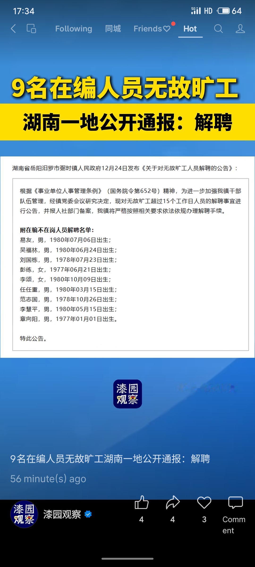 湖南汨罗市弼时镇9名在编人员因无故旷工超过15个工作日,被当地政府依据《事业单位人事管理条例》予以解聘,并公开通报名单及报备人社部门。