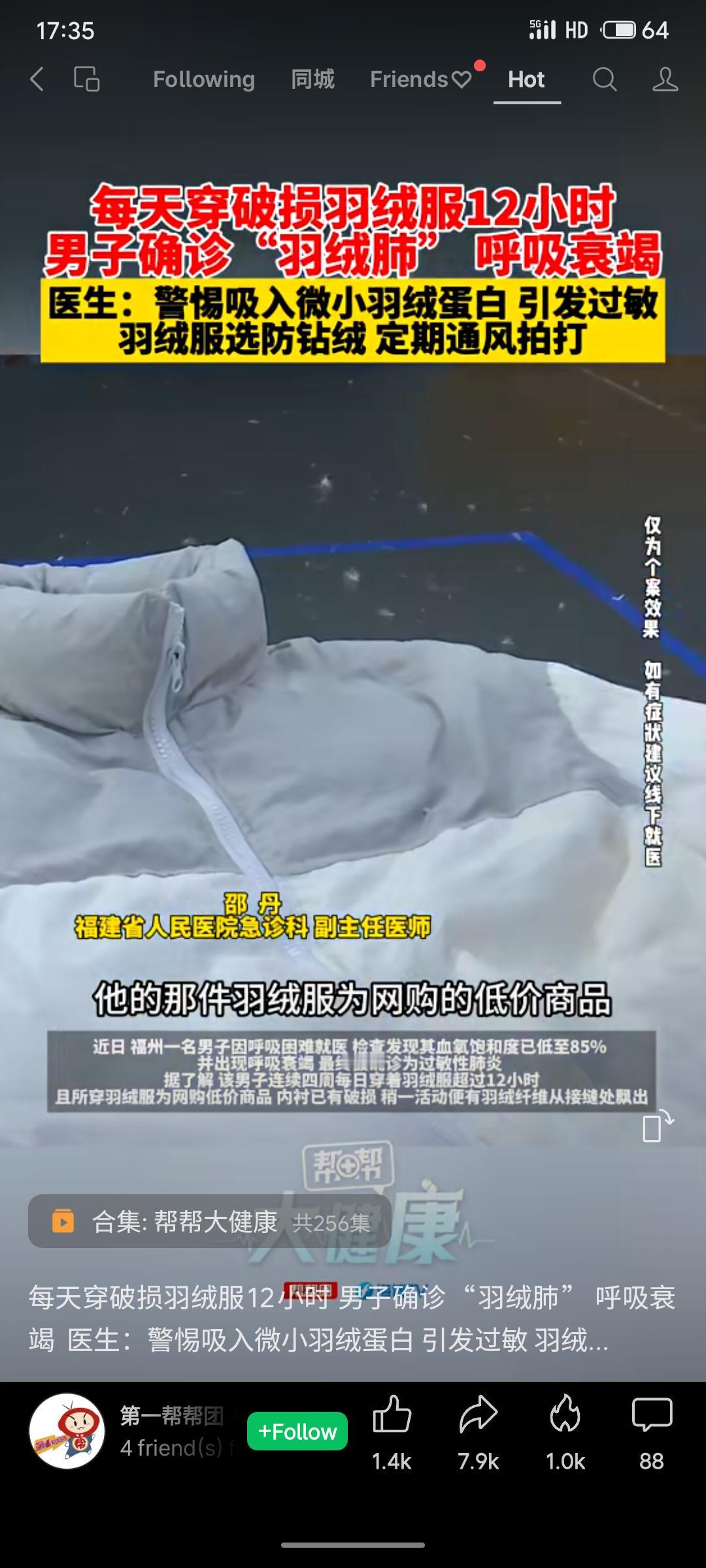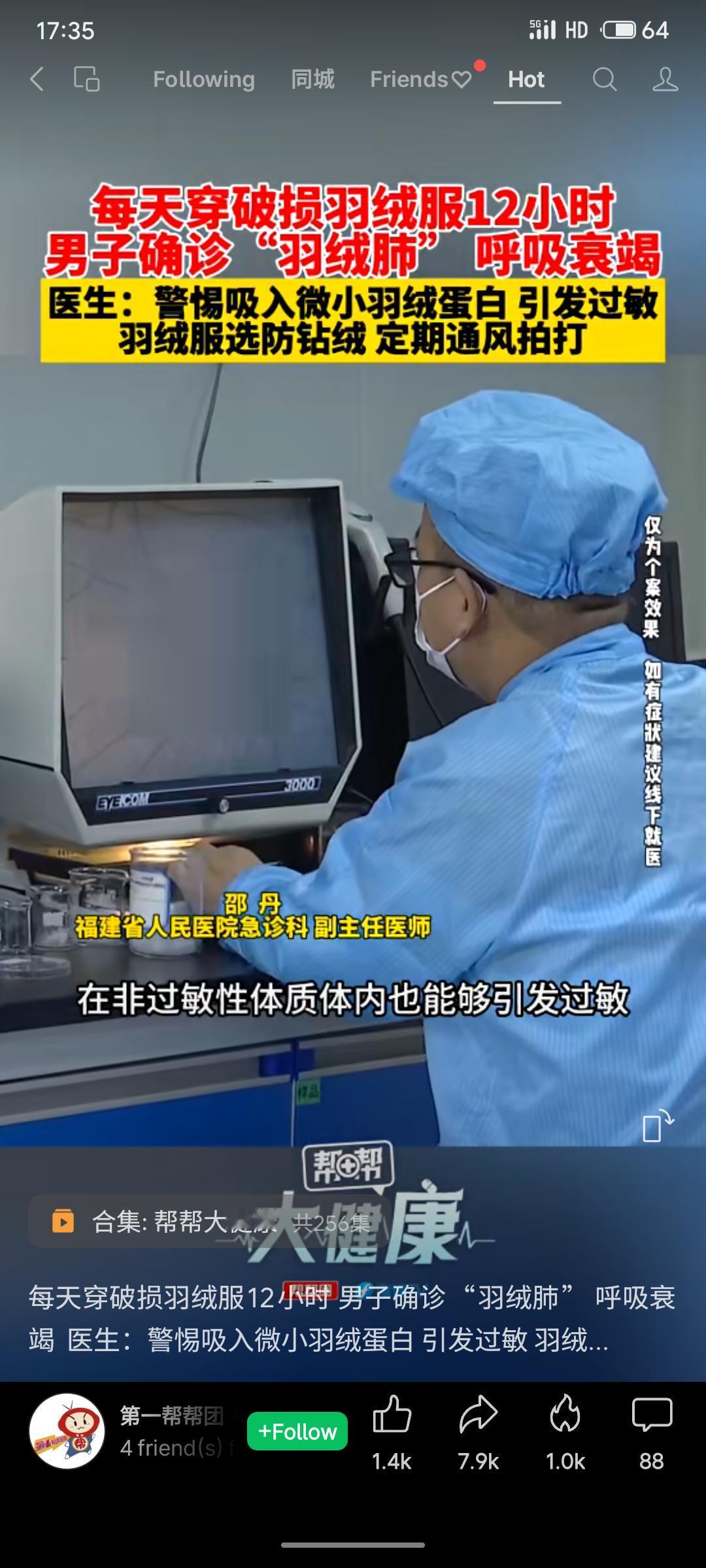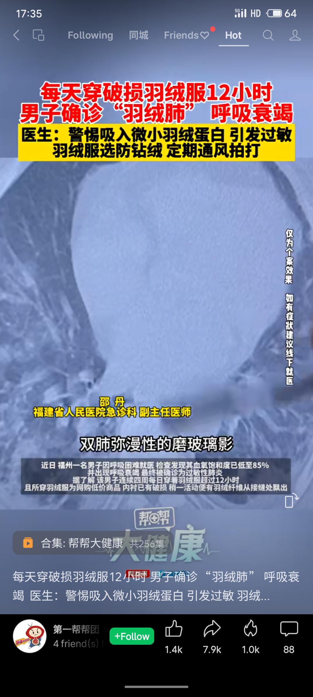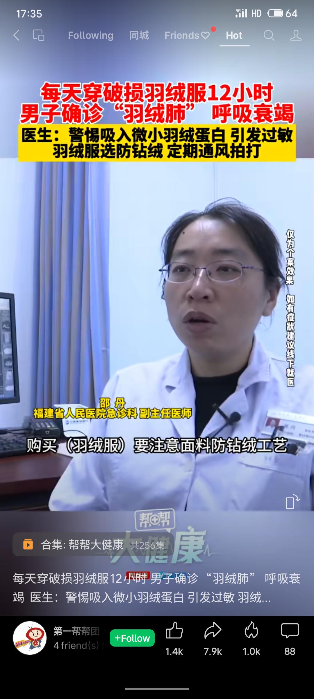 福州一男子连续四周每日穿破损羽绒服超12小时,吸入羽绒纤维后引发过敏性肺炎(俗称“羽绒肺”),出现呼吸衰竭。医生提醒应选购防钻绒面料羽绒服,并定期通风拍打,避免吸入羽绒蛋白导致过敏。