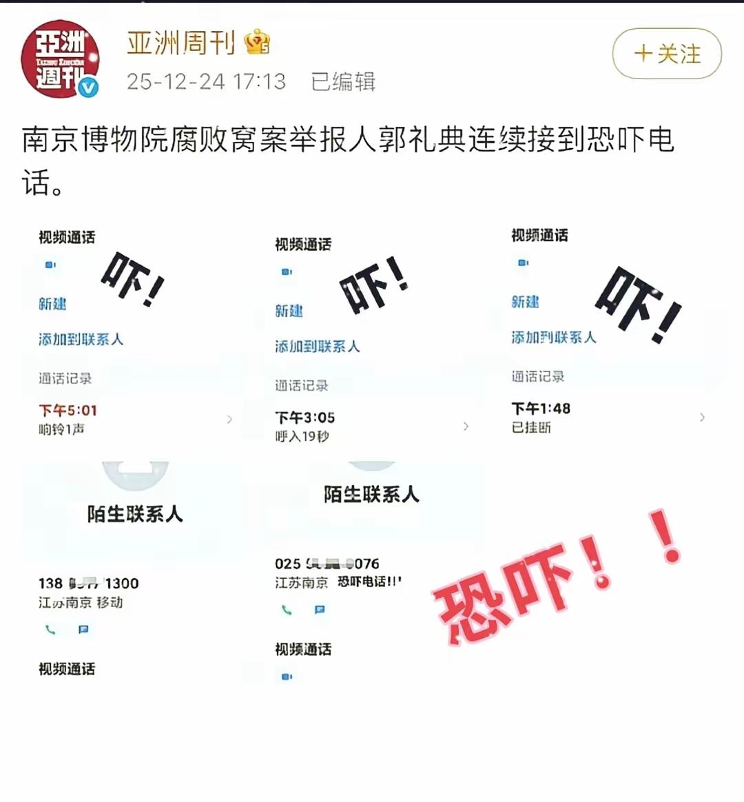 亚洲周刊消息称,南博案件中的举报人郭礼典前脚刚从西康宾馆出来,后脚 恐吓电话就追过来了。 上午刚说真话,下午就被南京、镇江、甘肃的六七个虚拟号轮番轰炸,19秒的“不要乱说话”,字字透着阴狠。这哪里是吓唬一个老人,分明是在挑衅监督规则,更是在践踏举报人保护制度。 实名举报者的信息能被精准泄露,说明背后的利益链条早就打通了关节,所谓的实名制和保密规定,在他们眼里成了摆设。保护不了说真话的人,谁还敢站出来揭露黑幕? 严查泄密的“内鬼”、严惩恐吓者,不是选择题而是必答题。你觉得该怎么给举报人筑牢“安全墙”,让他们不用再怕打击报复?