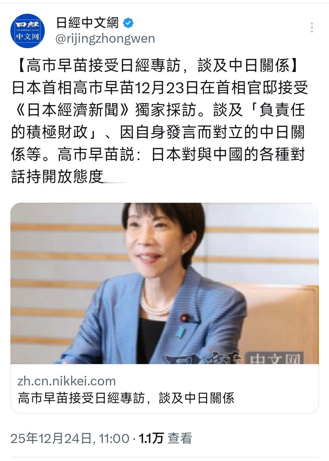 高市早苗这次要彻底跟自己“翻脸”了!?12月23日,她在首相官邸接受《日本经济新闻》专访,不仅谈到了日本的财政大计,更直言不讳地提到了因她个人发言而变得对立的中日关系。 乍一看,高市早苗是有服软的意向的,毕竟她说“日本对与中国的各种对话持开放态度”。 然而,她很可能还是想继续钻空子,她要是真心想缓和中日关系,那最好直接道歉,而不是含糊其辞扯。 毕竟众所周知,开启这次中日关系紧张的罪魁祸首是她,中国反制日本,说到底还是因为通过外交渠道发出的警告被日本忽视,才导致中国开启了实质上的反制措施。 说难听点,高市早苗就是又怕中国加码反制,又不想拉下脸面跟中国道歉,所以才憋出这么一段回应,说的好像中日双方在这次紧张中的责任是对等的一样。 而且,现在是日本因为中国的反制,导致日本的经济遭致了影响,高市早苗不道歉,难道等着中国道歉吗?所以实事求是讲,高市早苗再含糊其辞下去,为其买单的还是日本自己。