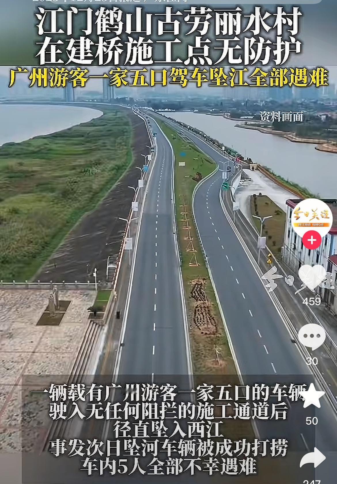 震惊,广州一家5口江门坠西江全部遇难,包括4个大人,1个小孩。事情发生于12月13日傍晚左右,这一家5口去江门古劳丽水周边自驾,游玩结束回程的路上,误入在建的西江特大桥便道,为连接新会和南海的高速配套工程。因为标识不明,直接开车进入,导致所驾车辆坠入西江,人车全部沉入滚滚江水,等救援赶到时人已经都没了。一场令人痛心的事故,本应该可以避免,却因为施工方疏忽大意导致悲剧发生。五口被害 高速遇难