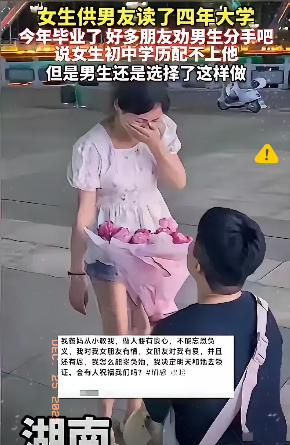 泪目了!湖南,男孩考上大学却没钱去读,女友打工供他读书!4年后男孩学业有成,朋友都说初中学历的女友配不上他,劝他分手!然而,男孩的一个决定让女友泣不成声...... 那束鲜花从背后递来的瞬间,女孩一时愣住,站在原地连呼吸都忘了调整,等男孩单膝跪下、轻声开口时,她的眼泪已经先一步夺眶而出。 真正的爱情从不是学历匹配、身份对等,而是你落魄时我不离不弃,你辉煌时带我并肩。李娟用四年流水线的汗水,把男友陈明送进重点大学,自己冻得感冒还硬撑,只为给他凑学费买棉袄。陈明没忘本,毕业拿着月薪过万的offer,第一时间不是应酬聚会,而是捧着向日葵向她求婚。 那些说“配不上”的人,根本不懂低谷时的陪伴有多珍贵。所谓门当户对,远不如“情分相当”靠谱——她用青春托举你的未来,你用余生回馈她的付出,这才是爱情最好的模样。 多少人成功后就忘了陪自己吃苦的人?陈明的选择告诉我们,感恩才是一个人最顶级的人品。你身边有这样不离不弃的感情吗?评论区说说你的看法!
