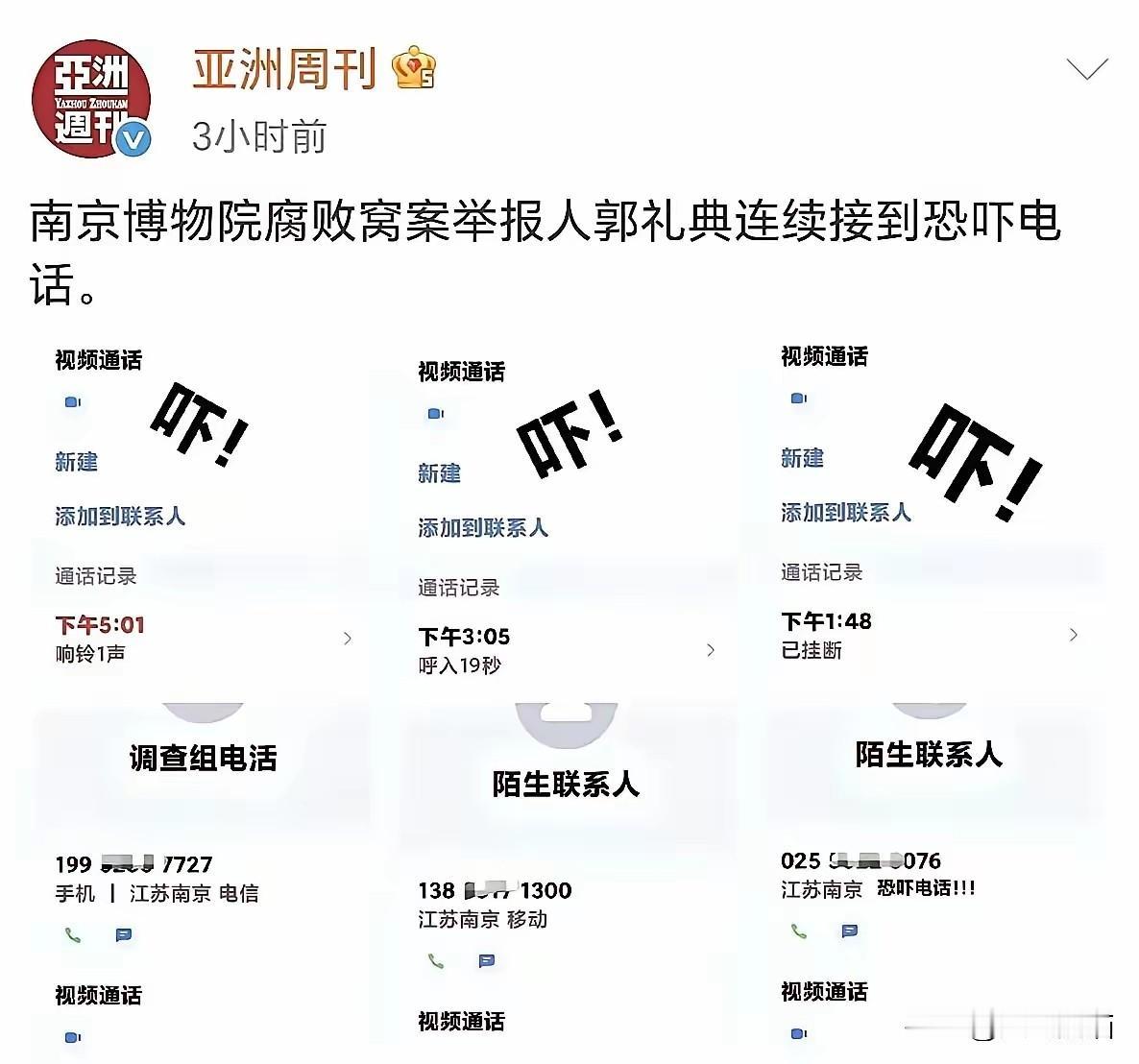 南京博物院举报人郭礼典,竟然接到了好几个恐吓电话。 这是香港的《亚洲周刊》的报道,作为南京博物院事件很重要的举报人郭礼典,在刚,接受完有关部门的谈话询问后,竟然接到了六七个恐吓电话。 看看这些势力还在做最后的垂死挣扎,他们是怎么知道举报人的电话,又是怎么知道什么时间在西康宾馆接受完工作组的问询。 还有的人要求邀请香港廉政公署介入联合调查,其实咱们的调查组完全就可以把真相查出,并将这些蛀虫绳之以法。