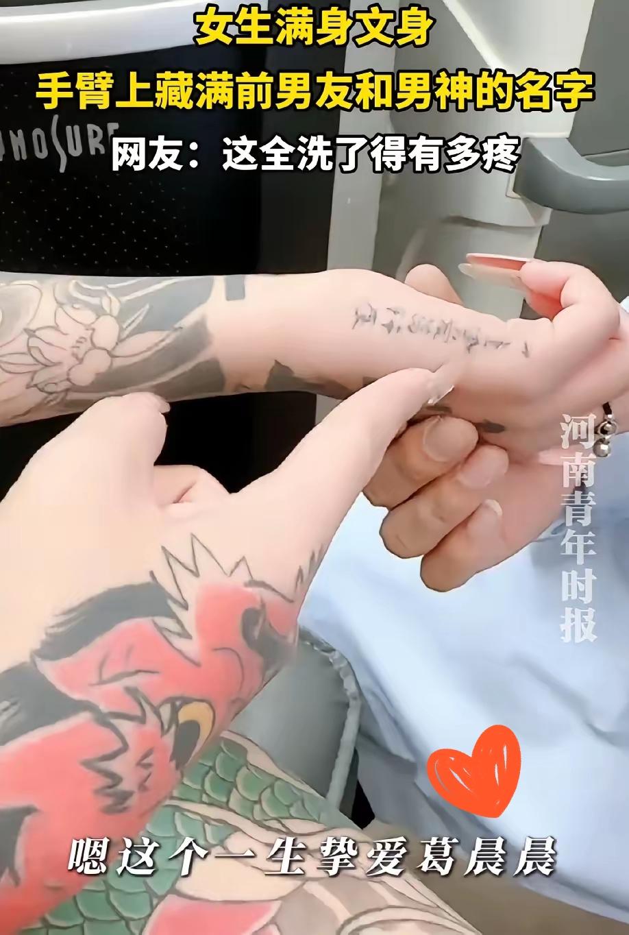 山东这姑娘的操作,真的看傻一众网友!满身密密麻麻的纹身,胸口那句“祝刘总顺风顺水顺财神,父母铺路不如刘总赞助”,活脱脱把自己纹成了移动广告牌,明眼人都猜得到,这怕是直播间榜一大哥狂刷嘉年华换来的“回报”吧! 再瞅手背上的“千手英雄胆”,手侧的“一生挚爱葛晨晨”“男神严文浩”,胳膊脖子腰上还藏着好几个前男友的名字。嘴上喊着一生挚爱,纹在了皮肤上,咋还一个接一个地分了手? 纹身确实是个人自由,可人家纹的是花鸟鱼虫、励志短句,她倒好,把感情和利益全刻在身上,旧的盖新的,好好的皮肤弄得黢黑一片。 我就纳闷了,把别人的名字刻在身上,真的能留住所谓的“爱”吗?