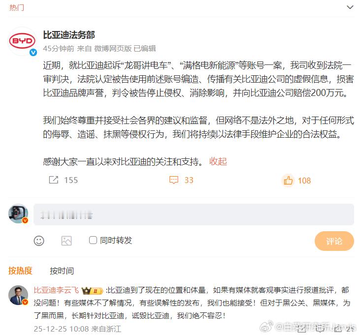 法院判决自媒体赔偿比亚迪200万元 又一个200万级顶格赔偿的选手,真的,何必呢?龙哥那场直播我还有印象,直播过程中收到通知,反应太真实了。而且他们真不冤枉,你要说像李云飞说的一样,有问题说问题,只是偶尔一两个话题参与一下,都正常的。一年365天,天天不断,日日找茬,起诉后还在持续不断的输出,这谁看不出来你有问题啊?大v聊车