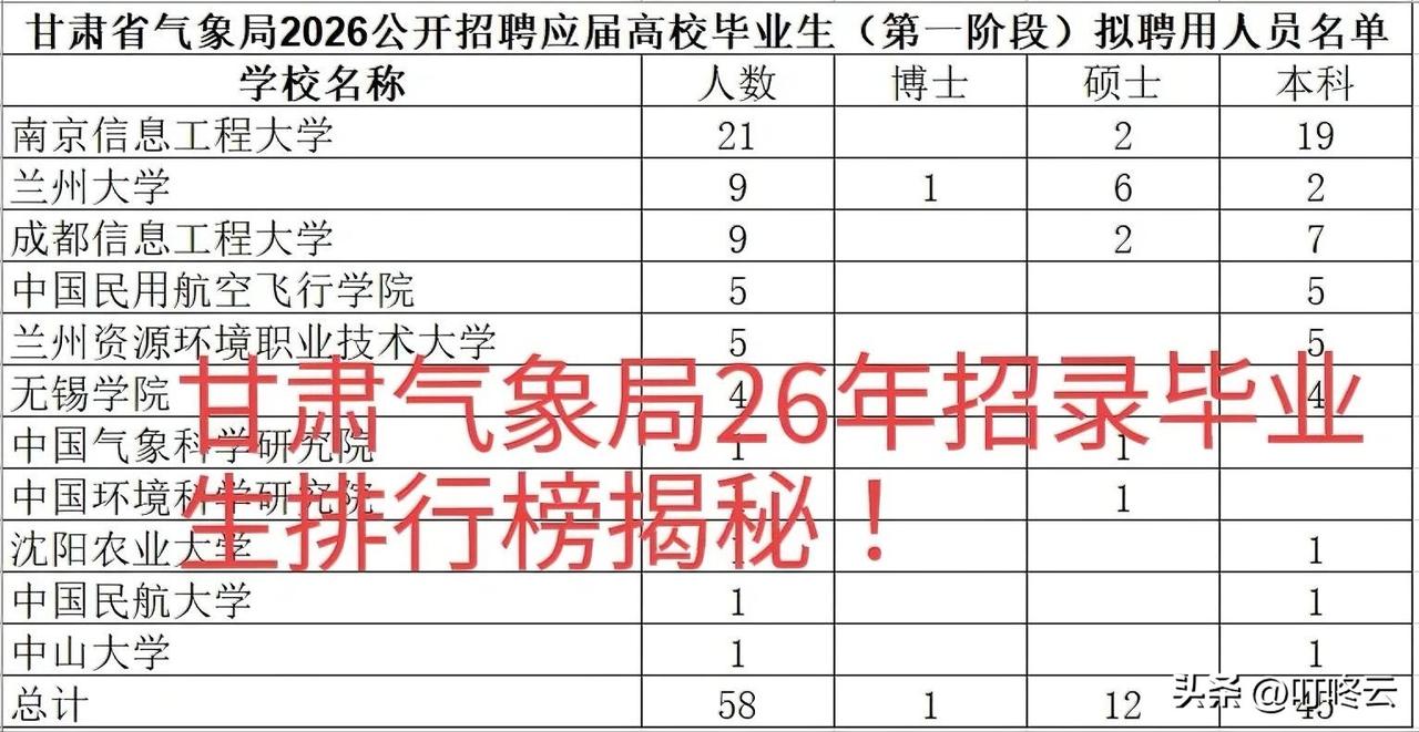 录用公示!甘肃省气象局26年招录毕业生人数排行榜!太尴尬了!兰州大学毕业生才9人;录用人员排行榜被南信工21人夺得第一名!就业录用人员背景分析来看,高校有特长,术业有专攻!想去哪里就业,一定要提前做好职业规划。速速围观揭秘详细内容![点亮平安灯][点亮平安灯][招财进宝][招财进宝] 欢迎关注@叮咚云 将优先为粉丝职业规划指导,1对1咨询是付费服务,为你定制最适合的就业择业方案!欢迎留言交流讨论。[来看我][来看我] 免责声明:图片来自网络,仅供参考!