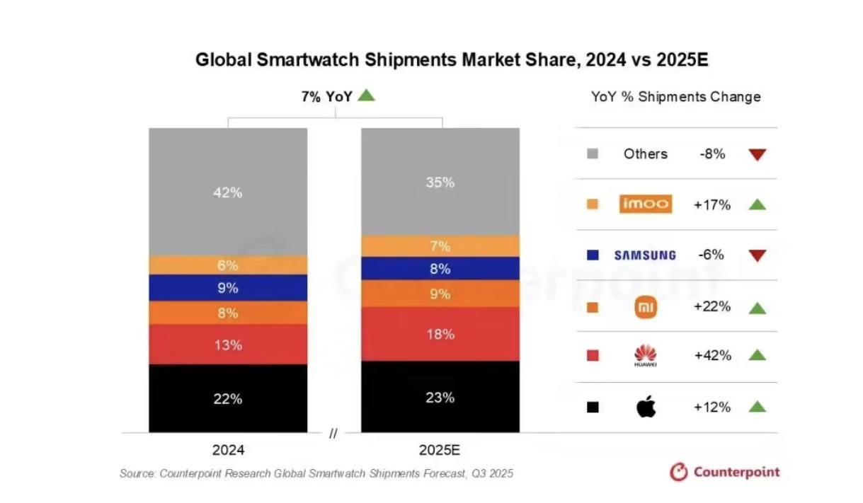智能手表市场真的回暖了,华为出货量同比暴涨 42% Counterpoint 最新预测显示,全球智能手表市场将在 2025 年底实现 7% 的同比增长。要知道,2024 年这是一个罕见“踩刹车”的品类,如今重新走强,背后信号很明确。 一是产品力真的在升级。新一代硬件、系统体验更成熟,尤其是健康相关功能,从“附加项”变成了用户刚需; 二是用户开始向中高端集中,不再只看价格,而是看生态、体验和长期价值; 三是,中国市场彻底站上 C 位。 报告直接点名:中国已成为全球智能手表最关键的增长引擎,市场份额预计从 25% 拉升到 31%。前五品牌里,三家来自中国也不是巧合——补贴政策叠加本土品牌生态优势,换机需求被持续激活。 品牌层面同样耐人寻味: ⌚ 华为出货量同比暴涨 42%,成为这一轮复苏的“领跑者”; 🍎 苹果在 2025 年 Q3 终于止跌回升,同比增长 12%,结束了连续 7 个季度的下滑; 📉 三星则仍在承压,同比下降 6%。 一句话总结:智能手表不再是“尝鲜设备”,而是正在进化为长期佩戴的个人健康终端。而这场复苏,真正的主舞台,正在中国市场。