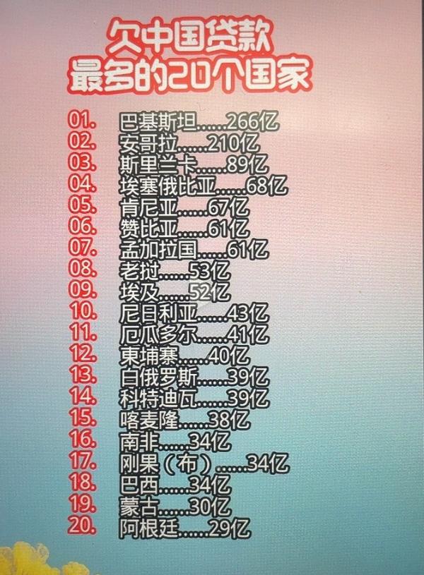 中国该捂紧钱包了!   看了这二十个国家欠了咱们近千亿的债务,心里着实不是滋味。这些国家皆是顶级穷国,估计这些钱大概率是还不回来了。   这二十个欠钱最多的国家,个顶个的都是“国际知名穷国”。像巴基斯坦、南非、安哥拉,这些名字在国际新闻里经常能看到。   咱们中国这几年,想着带着兄弟们一起致富,搞基建、修路、修电厂,这些钱不少都借给了这些国家。   说实话,咱中国对这些国家是真不算小气。有人说,咱中国做的是大国风范,愿意帮一把就帮一把。这想法当然没错,朋友多了路好走嘛!   可是,朋友归朋友,钱是钱,道理不能混为一谈。讲真,这些国家之所以借钱,是因为自己兜里真的没啥钱。   就拿巴基斯坦来说,这两年经济一直不景气,外汇储备都快见底了。南非、安哥拉也好不到哪去,国内各种问题缠身,别说还钱,有时候连自己政府开支都捉襟见肘。   更糟糕的是,有的国家不仅经济烂,还自带一副“理直气壮”的表情。钱借了,嘴上说着还,心里根本没打算这么快还。   甚至还有些国家,欠着钱还不领情,动不动就“翻脸不认人”,让人看了气不打一处来。俗话说,帮人帮到底,送佛送到西。   可是有的人,你给了他一碗饭,他还嫌你筷子短。咱中国这些年借钱的,有不少国家一边拿咱的钱修公路、盖房子,转头却在国际场合跟着别的国家唱反调。   甚至还在一些涉及咱中国核心利益的问题上“踩一脚”。这种“吃饭砸锅”的事,咱中国可没少遇见。   有的国家,明明靠咱中国的贷款才稳住了经济,可在欧美面前却摆出一副“两面人”的架势。需要钱的时候找咱中国,遇到利益分配的时候又想跟着美国、日本混。   其实,咱老百姓都明白一个道理:自己家里有钱,日子才过得安稳。国家也是一样。现在国内经济发展进入了新阶段,很多地方还需要大量资金投入。   这些都是让咱中国老百姓真真正正受益的事情。如果钱都借给了国外那些还不上账的“穷兄弟”,国内想搞点民生工程、基础设施,也得掂量掂量。   说白了,咱中国的钱要用在刀刃上,不能老是想着“做好人”,结果自己家里捉襟见肘。不少人说,咱中国借钱是为了扩大影响力,打造国际朋友圈。   这话当然有一定道理。毕竟,在国际上混,得有点“人情世故”。有时候,给兄弟们投点钱,确实能换来一时的支持和友谊。   但问题是,这种“借钱外交”到底值不值?如果老是借出去的钱收不回来,甚至连朋友都没交到,岂不是赔了夫人又折兵?   而且,等到关键时刻,有些国家还是会看利益,不一定真心站队咱中国。更何况,咱中国自己的发展才是硬道理。   过去几十年,咱中国能够“赢麻了”,靠的是自己埋头苦干。现在钱袋儿鼓了,当然要帮衬兄弟,可也得量力而行,不能一味大方。   其实,不止咱中国,世界上有不少国家都吃过“借钱打水漂”的亏。欧美那些国家,早些年也喜欢给发展中国家贷款。   结果发现,钱一出去,收回来的少之又少。有人甚至开玩笑说,有些国家的“还款计划”,就是“明天还、明年还、下辈子还”。   咱中国人讲究“雪中送炭”,但有时候也得防着“肉包子打狗:有去无回”。帮人是好事,但也要看对方是不是值得帮。   现在有些国家表面上和咱中国称兄道弟,背地里却算盘打得啪啪响。拿了钱不说谢,遇到点事还跟咱中国唱反调。   有网友说,既然这些国家还不上钱,咱中国以后干脆别借了呗。这话虽然直白,但也不是完全没道理。   可要真做到彻底不借,也不现实。毕竟,国际交往总要有来有往,完全闭门造车也不行。关键是,借钱之前得多长几个心眼儿。不能看到谁来讨钱就点头。   还要看看对方的人品、信用,能不能按时还,值不值得信任。必要的时候,还得设置“防火墙”,比如分期放款、用项目抵押、加强监管等等。   咱中国的钱包,要捂得更紧一点。每一分钱都要花得值得,让老百姓心里踏实。   每年老百姓交的税、国家赚的钱,都是一点一滴攒下来的。很多人一辈子辛苦打拼,换来的就是国家越来越强大、生活越来越好。现在经济压力也不小,国内还有不少需要花钱的地方。   如果钱老是被不靠谱的国家“借走”,到头来自己想用的时候捉襟见肘,那就真的划不来了。咱中国的钱,每一分都得用到正地方,不能养了“白眼狼”,还让他们反咬一口。   说到底,咱中国的善良和大气没人能否认。帮人帮到点子上,朋友才会越来越多。但也得记住一句老话:救急不救穷。   对于那些真正需要的国家,咱中国可以伸把手,但对于那些只知道伸手要钱、还不知感恩的“白眼狼”,该收就得收,该停就得停。   咱中国的钱包,是咱老百姓的血汗钱。以后借钱这事儿,真得打起十二分精神。别再让那些还不上钱、还不领情的国家白白占了便宜。   该帮的帮,该收的收,该断的断。这样,咱中国才能真正“赢麻了”,咱老百姓才能过得更踏实!国家的钱包,真得捂紧点,千万别再当冤大头!