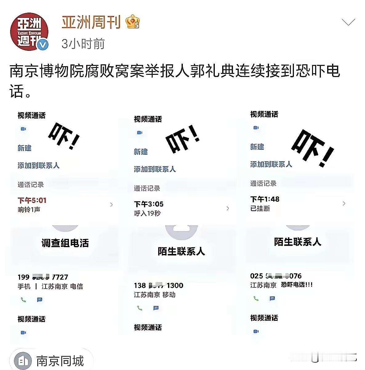 这些人真是吃了熊心豹子胆! 竟然到了现在,还敢恐吓举报人。 香港的《亚洲周刊》的报道,南京博物院举报人郭礼典,竟然接到了好几个恐吓电话, 这些人知道郭礼典正在接受有关部门的询问,害怕郭礼典把知道的一切都说出去,这样会把这个团伙一网打尽,会把更重要人牵出来。 对于这样的嚣张气焰,必须一查到底,一个不漏。