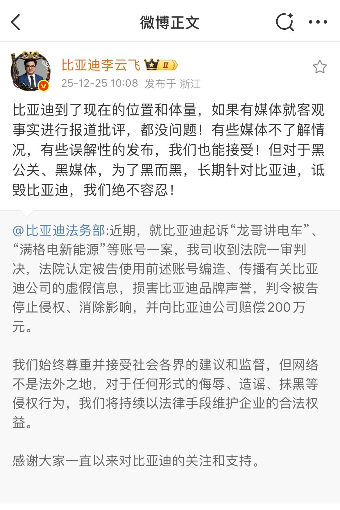 比亚迪起诉龙哥讲电车等获赔200万 太解气了,这帮孙子终于栽了比亚迪告这些傻福账号,法院判他们赔200万,该赔,把他们房都扒了。尤其是那个“龙猪-集车”,黑了迪子五年,满嘴喷粪,现在法院判它道歉赔钱,好!这种东西我燥称冯了个福迪子现在体量这么大,碰上这种专业黑子,一周五天都在扯蛋,是不是觉得六角大楼没人了?迪子悬赏500万打击黑公关,告一个赢一个,干得好!就是要让这些嘴跟屁股长拧了的东西倾家荡产央视、新华社都点名了这些行业乱象,支持迪子一告到底。