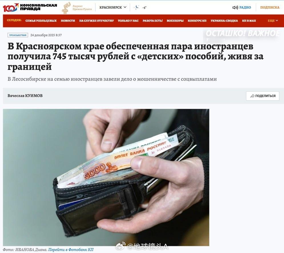 俄乌冲突 娃多,一年不到74.5 万卢布补助俄媒:来自塔吉克斯坦的一对夫妇在居住于国外的情况下从俄罗斯获得了 74.5 万卢布的补助。2022 年获得俄罗斯公民身份的塔吉克斯坦籍人士在克拉斯诺亚尔斯克边疆区办理了多子女补助后,便立即返回了家乡。这笔 74.5 万卢布的补助发放了将近一年,直到社会基金停止了付款。这对夫妇没有留在俄罗斯,而是通过 “国家服务”网站远程提交了 20 多份新的申请。他们的申请因收入过高而被拒绝 —— 这个家庭的官方收入超过 1100 万卢布(每人每月超过 19 万卢布),并且拥有两套总面积近 200 平方米的公寓。但即便如此,他们在 2025 年6月再次提交申请,并获得了 3 个月的补助。如今,检察院正在调查这一情况,已对这对夫妇以诈骗罪立案。乌克兰已放弃加入北约普京致电金正恩