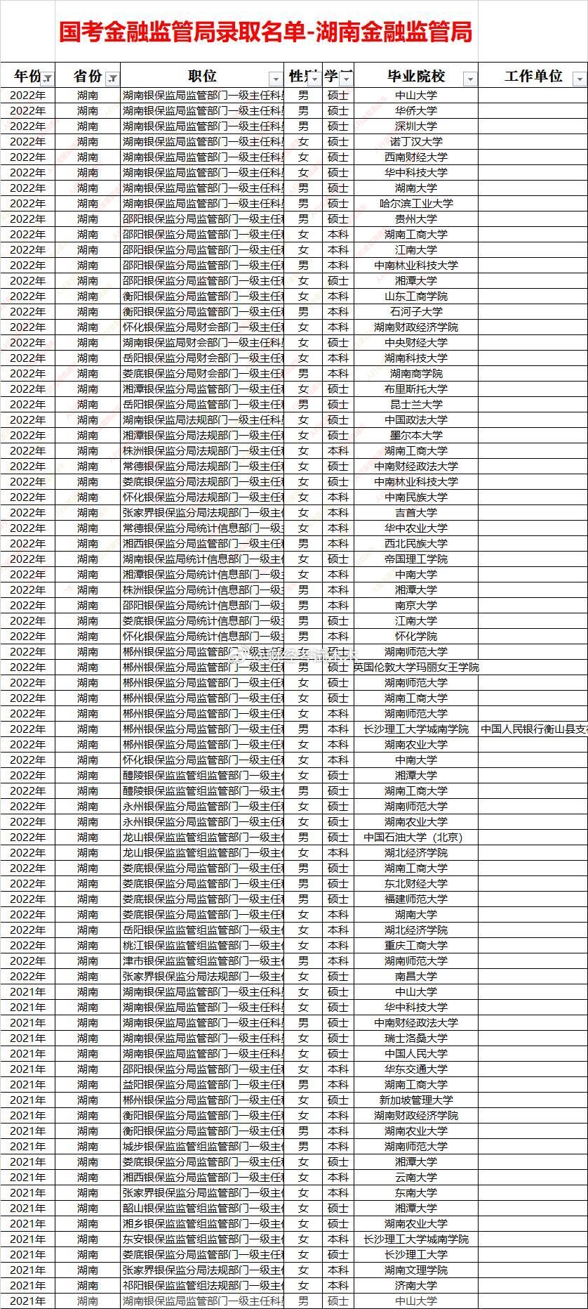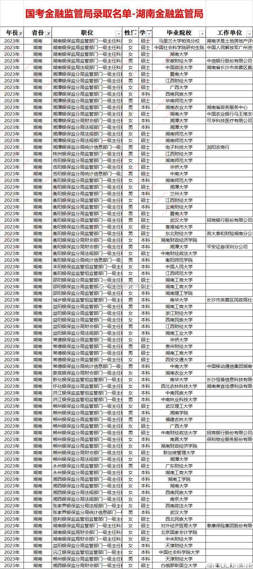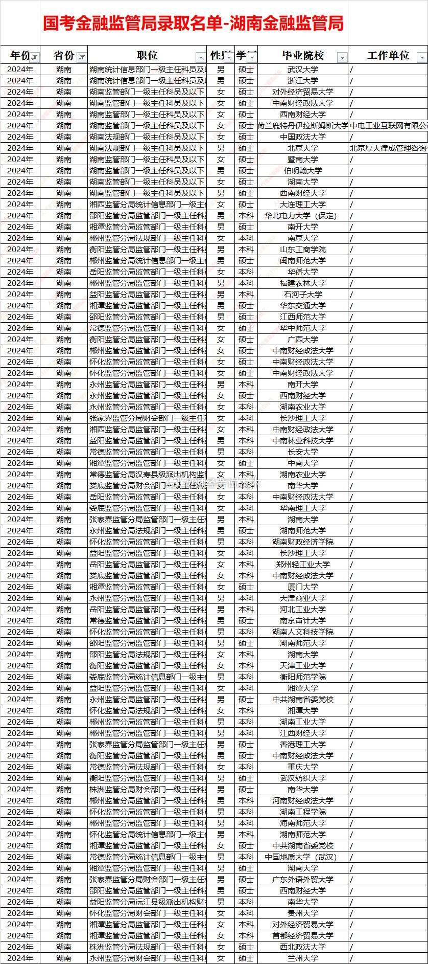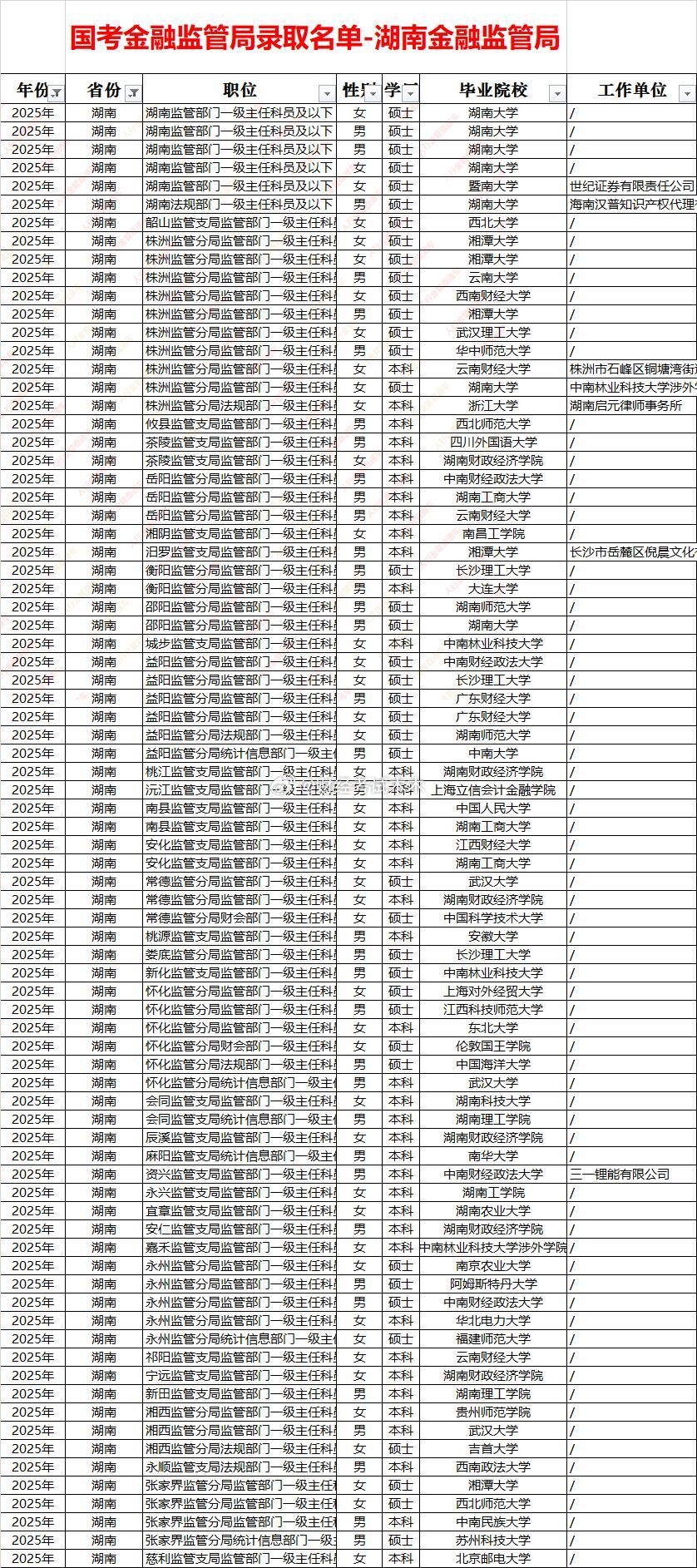 湖南金融监管局录取名单及面试入围分数线一、招录规模与结构五年累计录取约330人,年均66人,2023年峰值(约80人),2021年谷底(约40人)。男女比例长期1:1,女性略多;硕士占比由55%升至2025年76%,海归比例稳定在8%左右。二、高校层次“双梯”明显:顶尖/海外:中山大学、人大、港中文、伊拉斯姆斯大学、帝国理工、阿姆斯特丹大学等;省内核心:湖南大学、中南大学、湖南师大、湘潭大学、湖南工商大学。县级派出机构70%为省内本科,分局以上以硕士为主。三、分数线区间(2021-2025全部岗位)财经岗:47.6-71.4,省局稳态67-71,长株潭分局60-66,县级组48-56;财会岗:49.3-65.4,省局62-65,县级组50-55;法律岗:53.1-67.5,省局64-67,湘西、张家界等边远支局53-58;计算机岗:46.5-61.9,省局58-62,县级组46-52,为最低门槛岗位;综合岗:46.5-67.7,波动最大,长沙、株洲65+,湘黔边界县46-50。四、地域差“省局>长株潭分局>其他地市局>县支局”四级价差约10分;湘西、怀化、张家界新设支局首年普遍比长沙低8-12分,形成“低分洼地”。五、趋势2023年后硕士化加速,省局财经岗68+成常态;计算机、法律岗因扩招,分数线不升反降;县级组48-52区间仍可“低分上岸”,但学历门槛已提至本科以上。