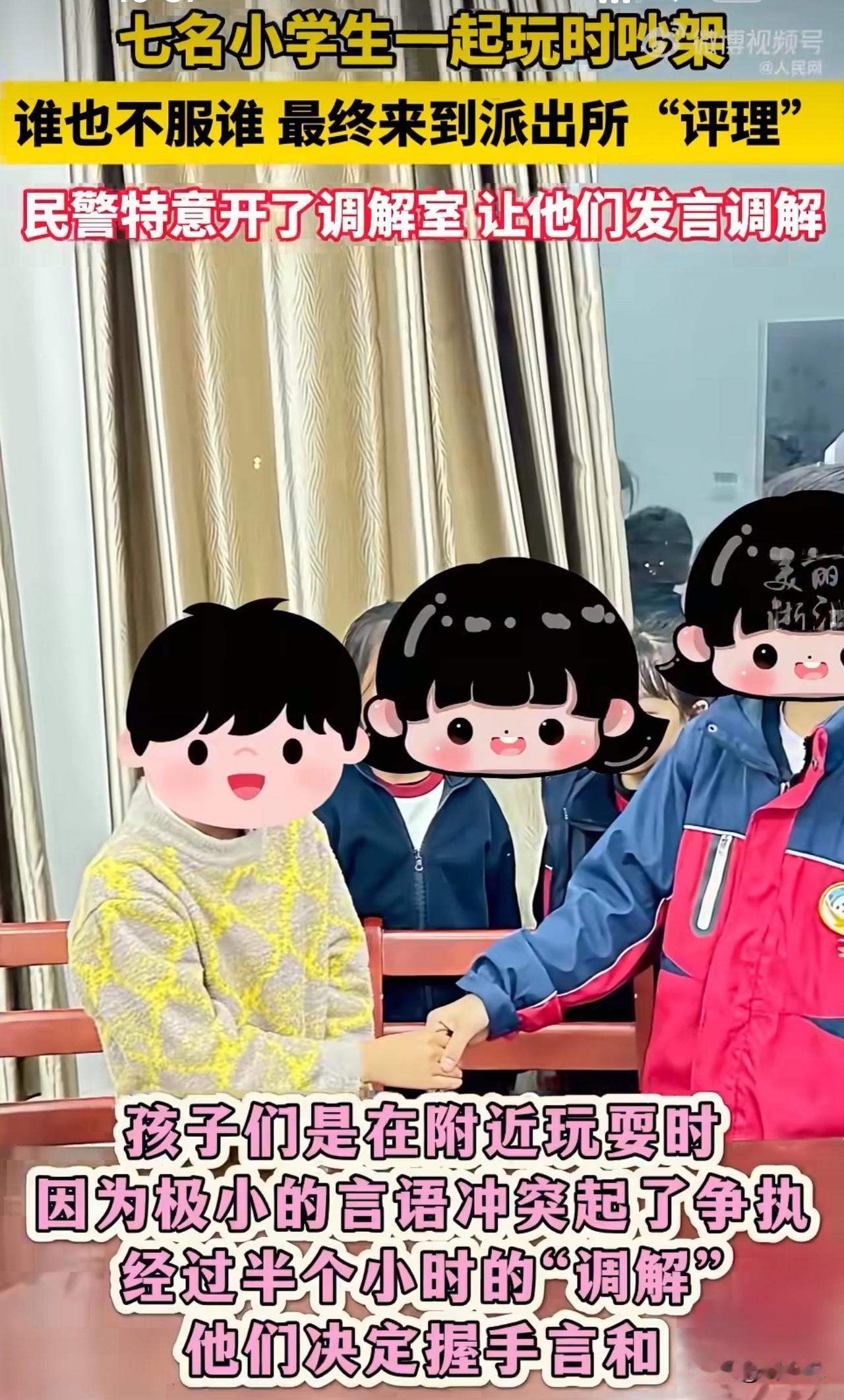 “笑哭!”浙江丽水,7名小学生一起玩时吵翻了天,谁也不服谁,谁也不肯让谁。最后,他们竟然一起“组团”走进了派出所——不是来报案,而是来“评理”的。这一幕,把值班民警都给整乐了。整个过程,没有批评,没有呵斥,只有尊重和引导。半小时后,7个孩子终于握手言和,临走前还向民警鞠躬致谢。 此事曝光后,有网友说:“这才是真正的法治教育从娃娃抓起,比在课堂上讲十遍都管用。” 也有网友感慨:“现在的孩子有问题会想到找警察,而不是打架、冷战,本身就是一种进步。” 在周少看来,这件事的意义,远远不止“小孩吵架”这么简单。 第一,孩子学会了用“说理”代替“斗气”。 他们没有用拳头解决问题,而是选择走进派出所,这是规则意识、法治意识的萌芽。 第二,民警的做法,是一堂生动的“情绪管理课”。 不嘲笑、不敷衍,让孩子把话说完,学会表达、学会倾听,也学会换位思考。 第三,对家庭教育和学校教育也是一种提醒。与其一味要求孩子“别吵架”,不如教会他们“吵完怎么和好”,学会沟通、学会认错、学会修复关系,比“从不冲突”更重要。 这7个孩子,吵了一架,也上了一堂最好的“成长课”。而那位愿意蹲下来,认真听孩子说话的民警,更值得我们点一个大大的赞。#寻美三湘# #长沙新朋友#