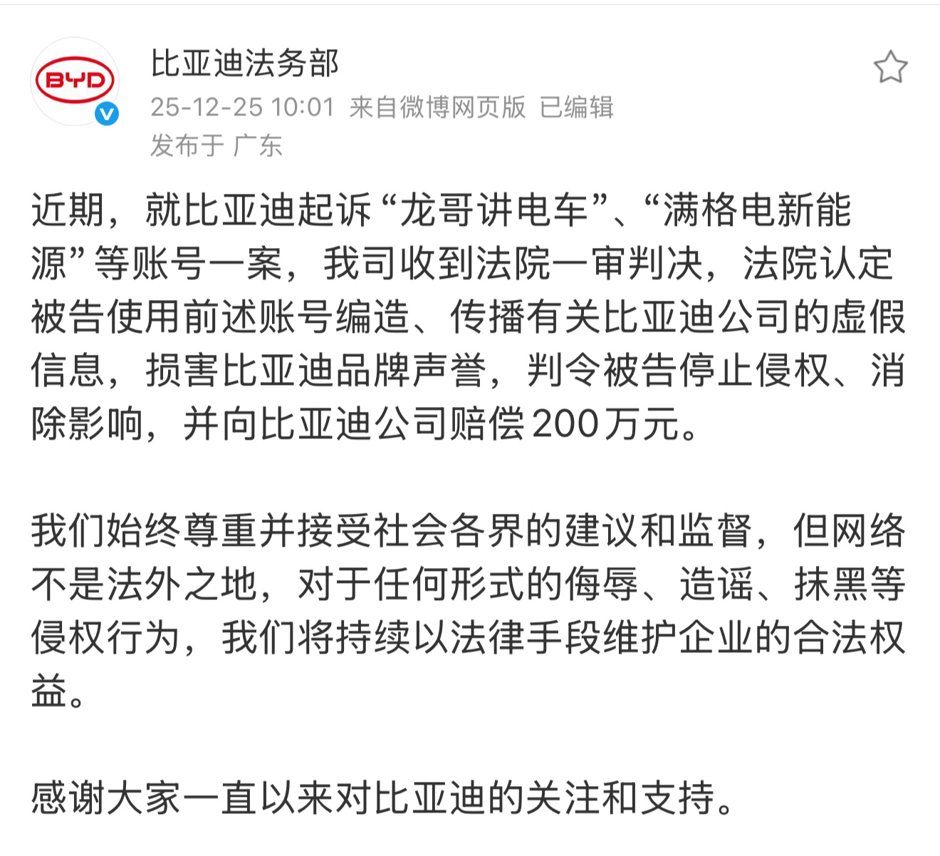 比亚迪法务部出手了!起诉“龙哥讲电车”造谣一审胜诉获赔200万。这个账号偷偷改了名,目前已经被全网封禁。而且他不光被比亚迪告,之前还被多家车企起诉,他的问题很严重。