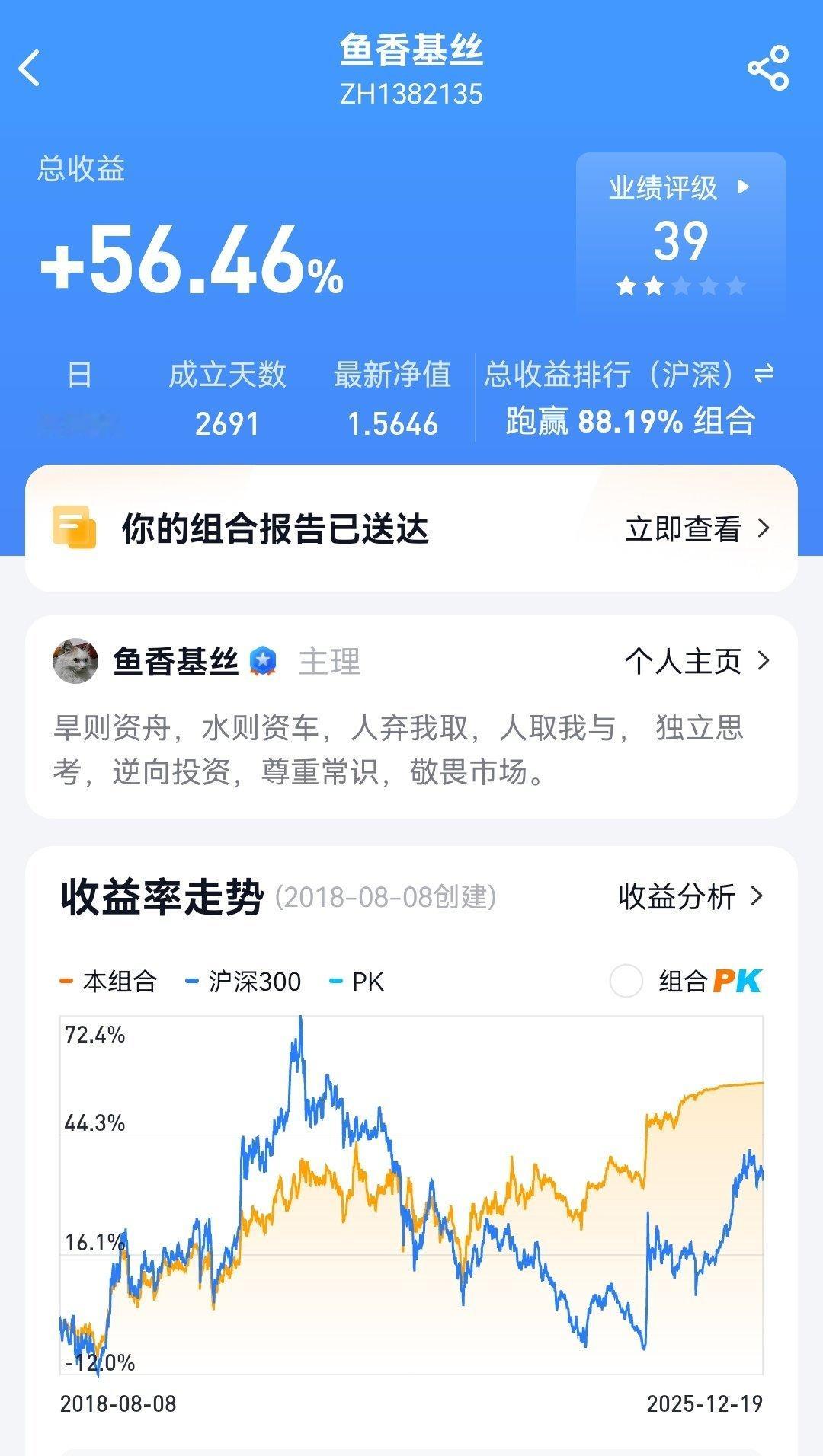 2025年12月19日鱼香基丝指数基金投资组合实盘周报成立以来场外组合收益率18.2%,场内组合56.4%,跑赢同期沪深300指数26个百分点。现在组合依旧空仓,全部在货币基金里。沪深300指数PE估值百分位依旧高达80%,所以空仓。很多人已经等不了了,手机有点钱就开始烧得慌,非要投资点啥,看见市场上有赚钱的就羡慕嫉妒。这个耐不寂寞的性子得改一下,现在很多人的赌瘾太重了,在资本市场里总想赌一下,自己不是那个接盘的人。当所有人都赚钱的时候,如果你在场,你就是那个买单的人了。投资基金a股