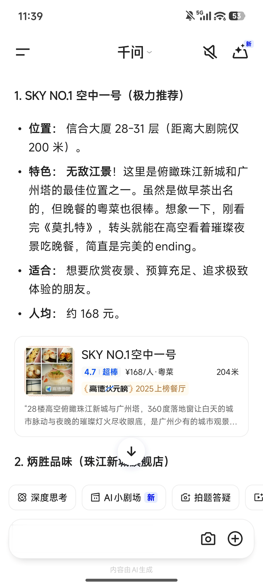 另外,如果用户让千问推荐某地点的附近餐厅,那么千问也会直接调用高德扫街榜的数据,给出一张高德卡片,用户点击之后可以跳转到高德查看餐厅信息和用户评价,并进行导航。
