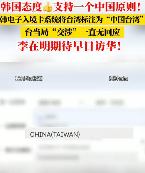 据台湾“中时新闻网”12月3日报道,韩国的电子入境卡申报系统中,将台湾标示为“中国(台湾)”。 台当局外事部门3日回应表示,台当局所谓“驻韩国代表处”已多次向韩国政府提出严正关切并交涉,但至今未获韩方正面回应。 韩国总统李在明办公室11月24日发表声明称,李在明希望在不久的将来可以访华。   据报道,韩国的电子入境卡申报系统里,把台湾明确标成了“中国(台湾)”,就这么个简单的标注调整,台外事部门立马跳出来表态,说他们所谓的“驻韩国代表处”已经多次找韩国政府交涉,态度说得挺强硬,又是“严正关切”又是要求更正,可结果呢?   韩国那边压根没给他们正面回应,相当于直接把这波抗议晾在了一边。   可能有人会觉得不就是个入境卡标注吗?至于这么大动干戈吗?   但对台当局来说,这恰恰戳中了他们最敏感的地方,这些年他们总在国际上想方设法刷“存在感”,试图搞各种“小动作”模糊两岸关系,可这次韩国直接把“中国(台湾)”的表述写进官方入境系统,等于从侧面印证了一个中国原则,这是他们最不想看到的。   更值得琢磨的是韩国的态度,不回应其实就是最明确的回应。   要知道,就在这件事之前没多久,韩国总统李在明的办公室刚发过声明,说李在明希望在不久的将来能访华。   这两件事放在一起看,就很能说明问题了,说白了韩国这么做,本质上是基于自身利益的务实选择。   中韩建交这么多年,双方在经贸、产业等多个领域都绑得很紧,韩国很清楚,一个中国原则是国际关系的基本准则,也是和中国打交道的前提。   现在把入境卡的标注理顺,其实是在为双边关系的稳定铺路,毕竟李在明有访华的意愿,肯定不想因为这种原则性问题给两国关系添堵。   反观台当局的交涉,从一开始就注定是徒劳的,他们所谓的“驻韩国代表处”,本身就不具备官方外交性质,这是中韩建交时就明确好的原则。   拿着不被承认的身份去提所谓的“严正要求”,韩国自然不会搭理。   而且国际上大多数国家都认可一个中国原则,联合国大会第2758号决议早就把这事定死了,台当局再怎么折腾,也改变不了台湾是中国一部分的事实。   还有个细节挺耐人寻味,有消息说韩国这个入境卡系统2月份就上线了,台当局其实早就知道标注的事,直到最近才大张旗鼓地抗议。   难免让人怀疑,他们是不是想借着这个事炒作话题,转移岛内的注意力。   可就算这么做了,结果还是碰了一鼻子灰,反而让更多人看清了他们在国际上孤立无援的处境。   其实不管台当局怎么闹,国际社会的共识摆在这里,一个中国原则不是谁想撼动就能撼动的。   韩国这次的操作,不过是把大家都默认的事实摆到了明面上。   对李在明政府来说,稳定好对华关系,推进务实外交才是重点,至于台当局的抗议,根本不值得他们花费精力去回应。   以上都是个人观点,对此您有什么不同的看法,可以在评论区留言讨论!!!