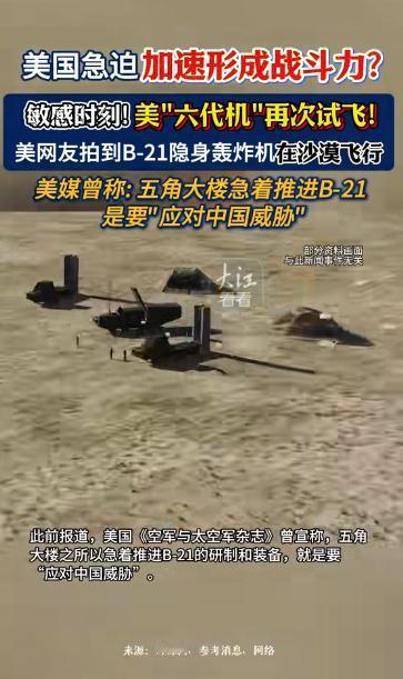 美国急迫加速形成战斗力? 敏感时刻!美"六代机"再次试飞! 美网友拍到B-21隐身轰炸机在沙馍飞行 美媒曾称:五角大楼急着推进B-21是要"应对中国威胁"   先说说网友拍到的B-21沙漠飞行,这次现身的不是首架测试机,而是编号T-2的第二架。   当时它在一架F-16D战机全程伴飞下,稳稳降落在了爱德华兹空军基地,和第一架测试机比起来,这架新机明显低调不少,机头下方醒目的橙色空速管没了,尾部的拖锥装置也取消了,连试飞徽章都没喷涂。   说白了,这背后是美军对B-21的机身设计和飞控系统越来越有信心,前期测试收集的数据已经足够支撑后续工作,没必要再装那些额外的测量设备了。   不只是B-21,美国六代机的进度也在明显提速,这款被命名为F-47的六代机是美军NGAD项目的核心,早在2020年就有全尺寸演示机完成了试飞,之后相关验证机已经积累了数百小时的飞行时长。   2025年3月,美军正式给它定了F-47的编号,还把超过200亿美元的研制合同交给了波音公司,看得出来是铁了心要全力推进这个项目,按照规划它会和B-21一同组成空军的第六代机队。   从公开信息来看,美军这波加速明显是有备而来。   可能有人会问,新装备从试飞到形成战力本来就需要漫长过程,美军为啥这么急迫?   其实看看它现役轰炸机的现状就清楚了,现在美军手里的B-1B机体寿命基本快到期了,B-2数量少还特别难维护,面对先进防空系统已经没了当初的优势,而B-52又比较老旧,只能当个防区外武器发射平台。   这么一来,B-21的重要性就凸显出来了,美军计划用它替换这些老旧机型,和升级后的B-52J组成新一代轰炸编队,至少要采购100架。   为了抢时间,美军在B-21项目上确实用了不少新办法。全程靠数字工程技术,从设计到制造基本都在虚拟环境里完成,测试机也是按生产线工艺造的,部分甚至能直接转为现役装备。   这种模式让B-21从签约到首飞只用了8年,比B-2的22年研发周期短了一大截。   现在第二架测试机加入后,美军还搞了双机并行测试,一边拓展飞行性能,一边攻坚武器集成,就是想把系统验证周期缩短40%,争取2027年就能形成初始作战能力。   值得注意的是,有美媒之前就报道过,称五角大楼急着推进B-21项目,核心目的之一就是“应对中国威胁”。   从美军的装备更新节奏来看,这种说法并非空穴来风,但所谓的“威胁”更多是其维持军事霸权的借口。   毕竟在全球安全格局下,各国发展防御性装备本是正当权利,美军这种急于形成代差优势的做法,反而可能加剧地区军备竞赛。   以上都是个人观点,基于公开的军事信息梳理分析,对此你有什么不同的看法,可以在评论区留言讨论!!!