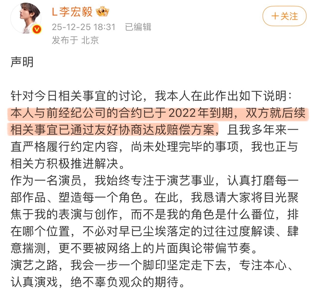 李宏毅和工作室都回应了和湖南芒果娱乐经纪合同以及被限制高消费的问题。简单来说就是李宏毅和芒果娱乐22年合约到期,双方共同承担违约责任,李宏毅需要赔偿1308万元,由于没那么多钱只能分期支付,芒果提出强制执行,法院对李宏毅限高。
