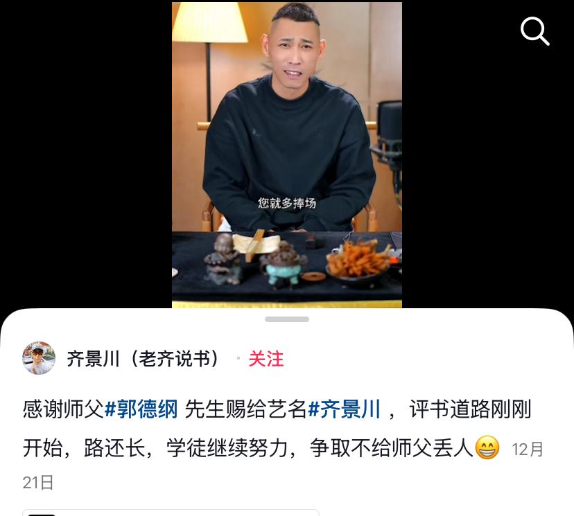 【郭德纲再收评书门弟子,曲线拜师郭德纲成为新方式,对此你怎么看?】 近日,抖音平台有一个“老齐说书”发出一条声明,声明称自己正式拜师郭德纲并且得到郭德纲给的艺名叫做齐景川,由此引发网友的关注!据了解,这是郭德纲评书门的排字,如此看来郭德纲是正式收下这个弟子了!无独有偶,之前就有郭德纲相声门的师弟郭胜文、高玉凯、高晓攀等人也是通过评书门拜师郭德纲,曲线拜师郭德纲似乎成为一种新方式!对此,你怎么看? 其实,这样的拜师无非就是牢牢绑定自己和郭德纲的关系,也是成为自己出入德云社的通关文牒,同时也是和德云社相声沾边的一种方式!当然,艺术上有自己的师承关系,说书也是名正言顺,如此也能够为自己的艺术道路增添新的发展方式!这样曲线拜师的方式,也是抹平相声辈分上的差距,为评书这门艺术发掘更多人才,培养更多的后备力量,这个也是郭德纲的初衷,也是这帮弟子的从艺初衷!当然不排除有些是为了蹭一份郭德纲弟子的身份,因为这样能够上德云社的家谱,自然而然也是成为一种履历!