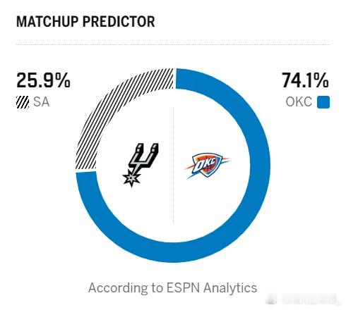 明日常规赛,。赛前,两队预测胜率,雷霆胜率74.1%,马刺胜率25.9%。目前,雷霆取得了26胜4负的战绩,马刺则为22胜7负。