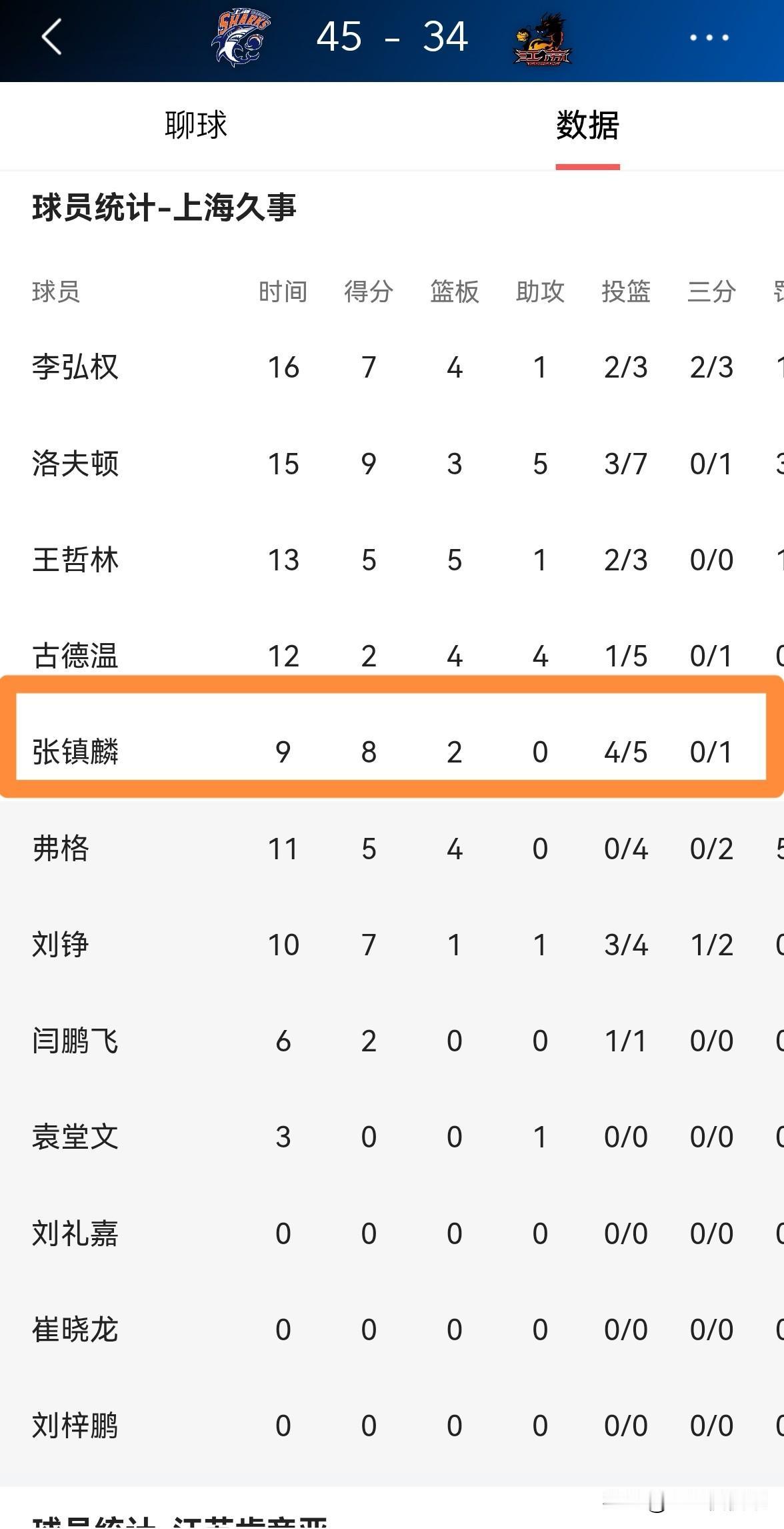 上海久事超级新援张镇麟真是手感滚烫!在今天上海久事主场迎战江苏肯帝亚的比赛中,目前双方半场战罢,上海久事以45:34领先对手。值得一提的是在前两节比赛中,张镇麟的投篮手感异常火热,他在首发出战的9分钟里,投篮5中4非常高效的砍下8分,还有2篮板,没有犯规。 如果张镇麟能够在接下来的比赛中延续这样的出色表现,那么上海久事绝对夺冠有望。